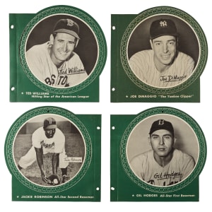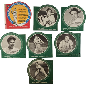 Complete set of 10 players from the 1950 All-Star Baseball "Pin-Up" series, separated from the original book in which they were issued, but still mostly attached at the perforations. These seven-inch diameter black-and-white player photos were issued in a booklet and designed with perforations around the edges to be punched out of the page and displayed. The reverse of each player picture has playing tips (hitting, base stealing, etc.). The front and back cover pictures Ted Williams in his familiar swing-thru pose with a list of the 10 players featured on the inside pages of the book and the slogan "Punch 'Em Out - - - Pin Em' Up!" printed along the bottom. The cardboard booklet cover is included (damage to the lower part of the spine and missing the metal binders, otherwise Vg-Ex in appearance). All pin-ups except DiMaggio are partially detached at the perforations (approximately 20-25% detached in most cases). The set consists of the following (grades refer only to the key circular portion of the page, with mostly minor wear visible around the perimeter of each page): Joe DiMaggio (light color toning on reverse, otherwise Nr/Mt), Jim Hegan (Ex), Gil Hodges (Ex), George Kell (Nr/Mt), Ralph Kiner (left edge trimmed, otherwise Vg due to small tear), Stan Musial (small circle piece at top punched out, otherwise Ex-Mt), Mel Parnell (Nr/Mt), Phil Rizzuto (Nr/Mt), Jackie Robinson (Ex+), and Ted Williams (Vg). A strong example of this unusual early 1950s issue! Total: 11 items (ten pin-ups and booklet cover).