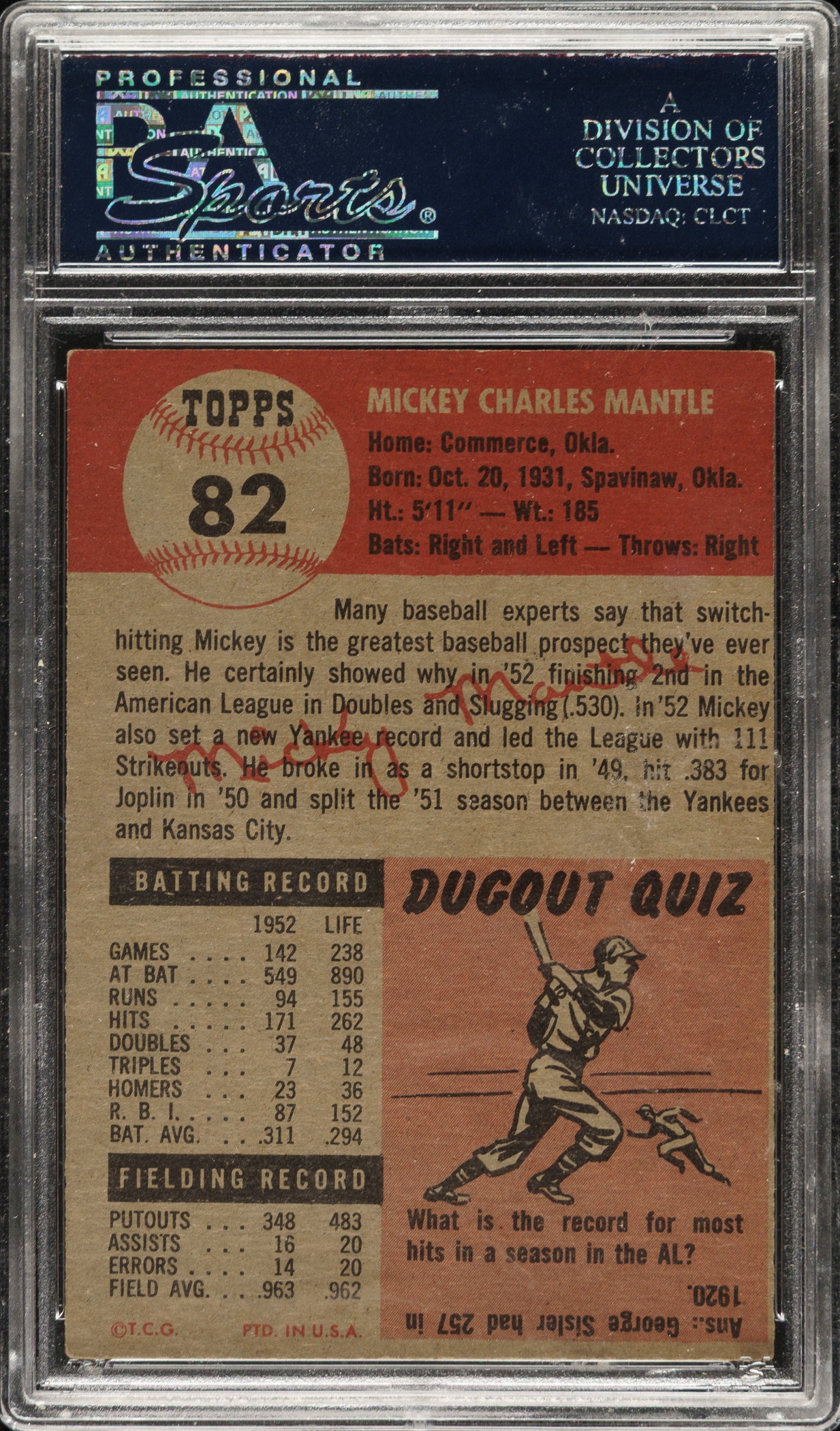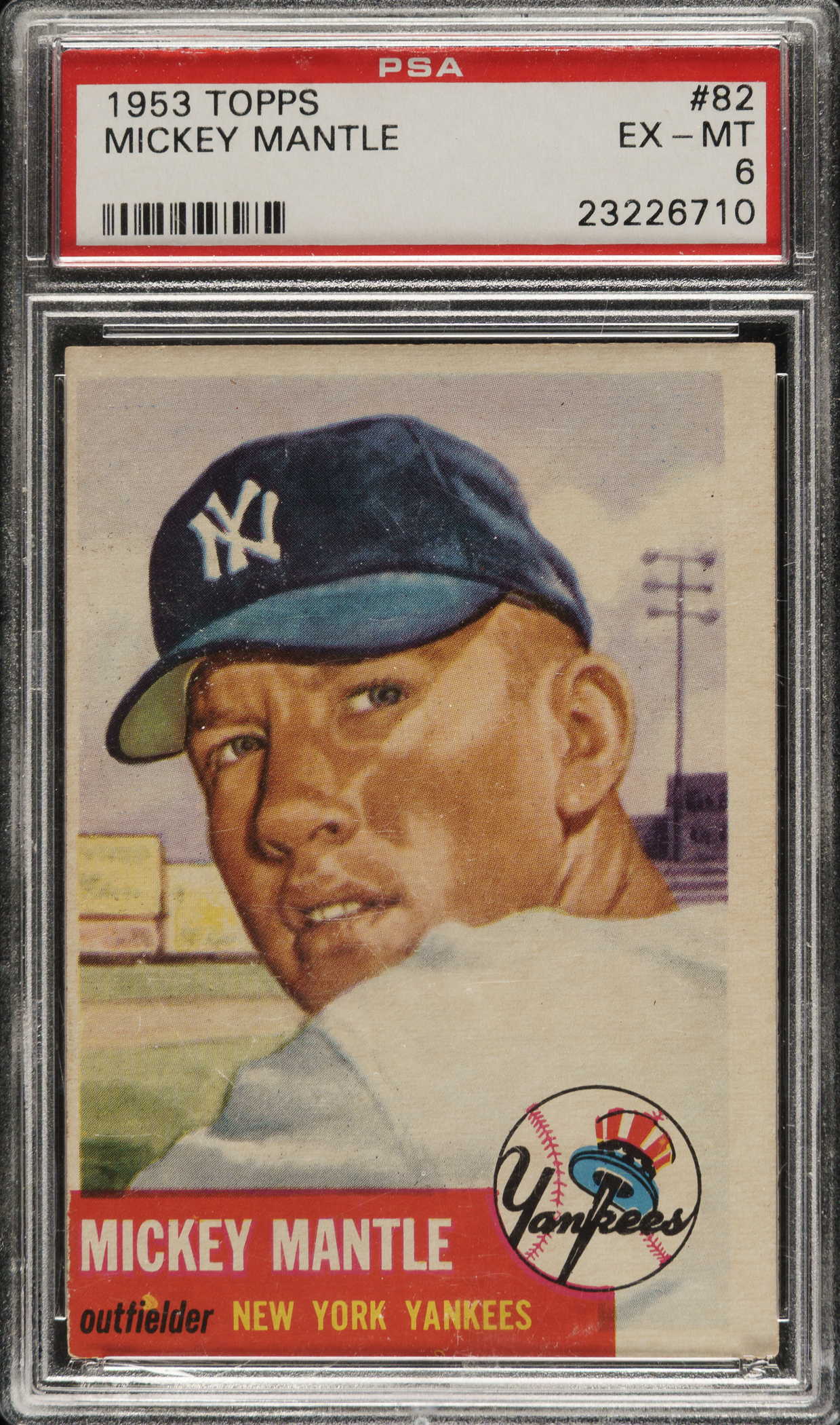 Graded EX-MT 6 by PSA. Fantastic example of New York Yankees Hall of Famer Mickey Mantle's second Topps card. One of card collecting's classics, Mantle's second Topps card is the key to the 1953 Topps set and one of the most popular of all postwar baseball cards. This card has bold colors, outstanding registration, and light corner wear. Clean reverse.