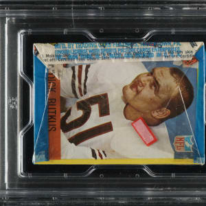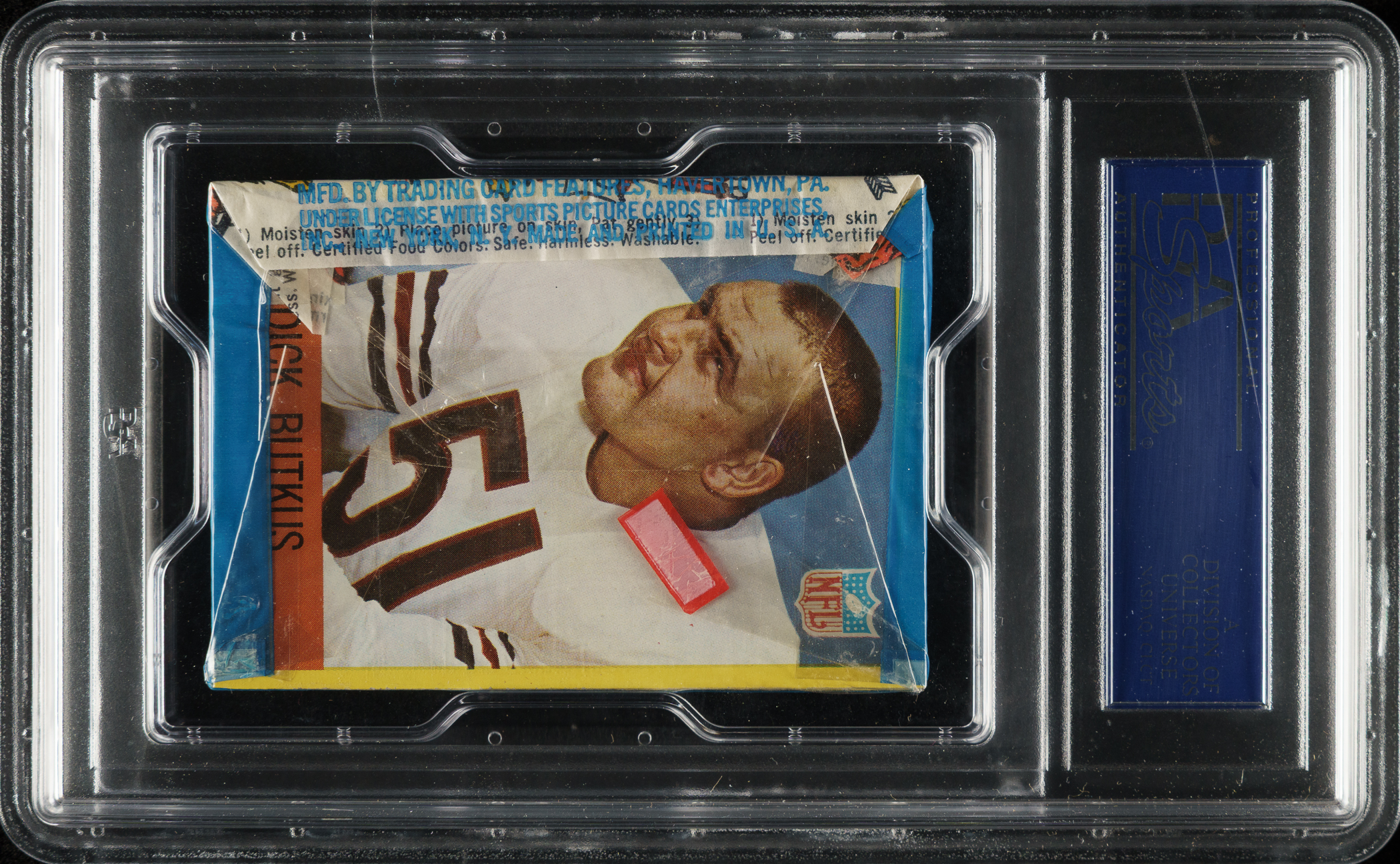 Graded MINT 9 by PSA. One of only three examples graded at this level by PSA, with none higher! Original unopened cello pack from the 1967 Philadelphia football set, highlighted by Hall of Famer Dick Butkus (#27) showing on the bottom. The pack has a beautiful full-color wrapper, a tight seal and no staining. The corners are all intact. This is an outstanding original, unopened cello pack that would make an excellent companion piece to a 1967 Philadelphia football set.