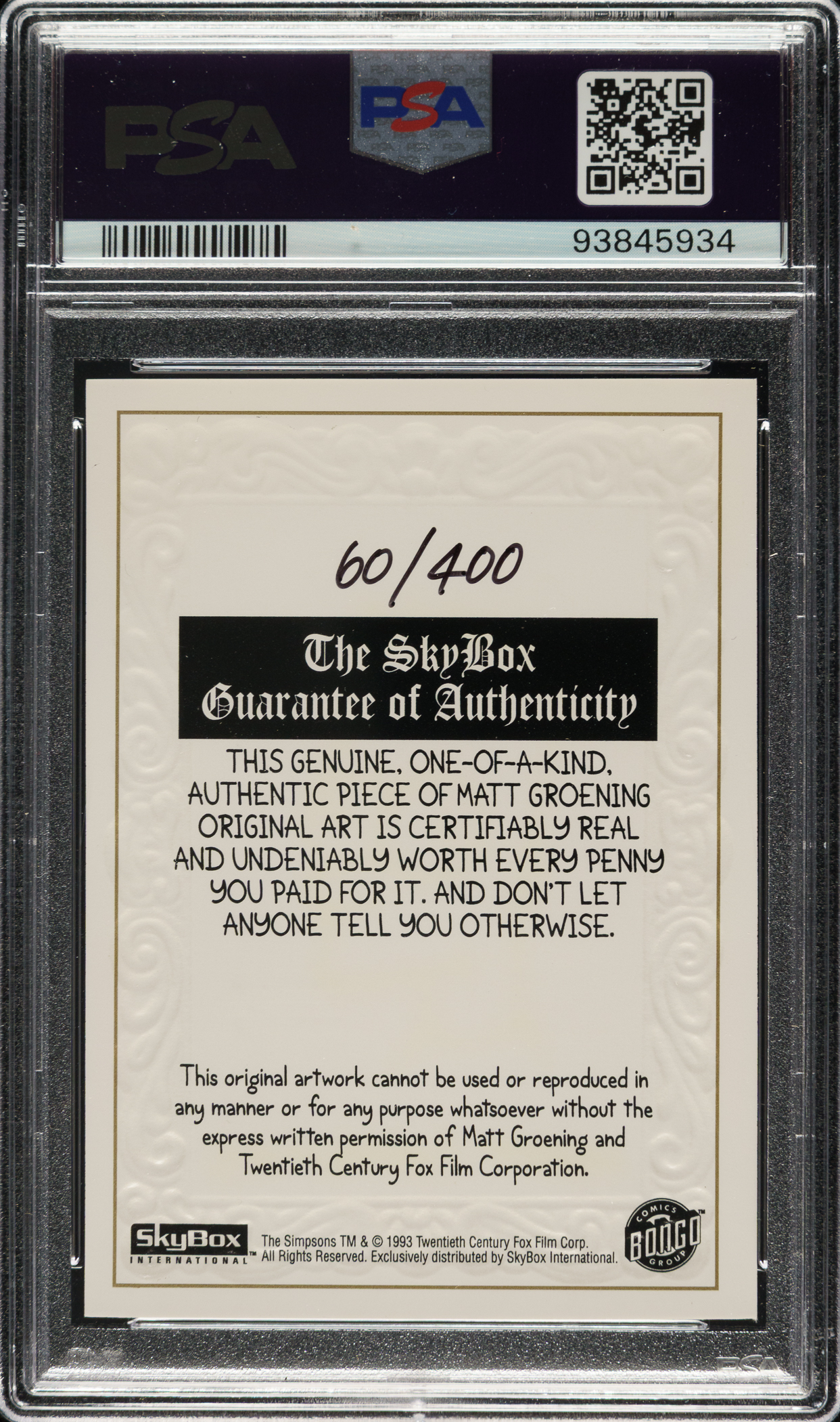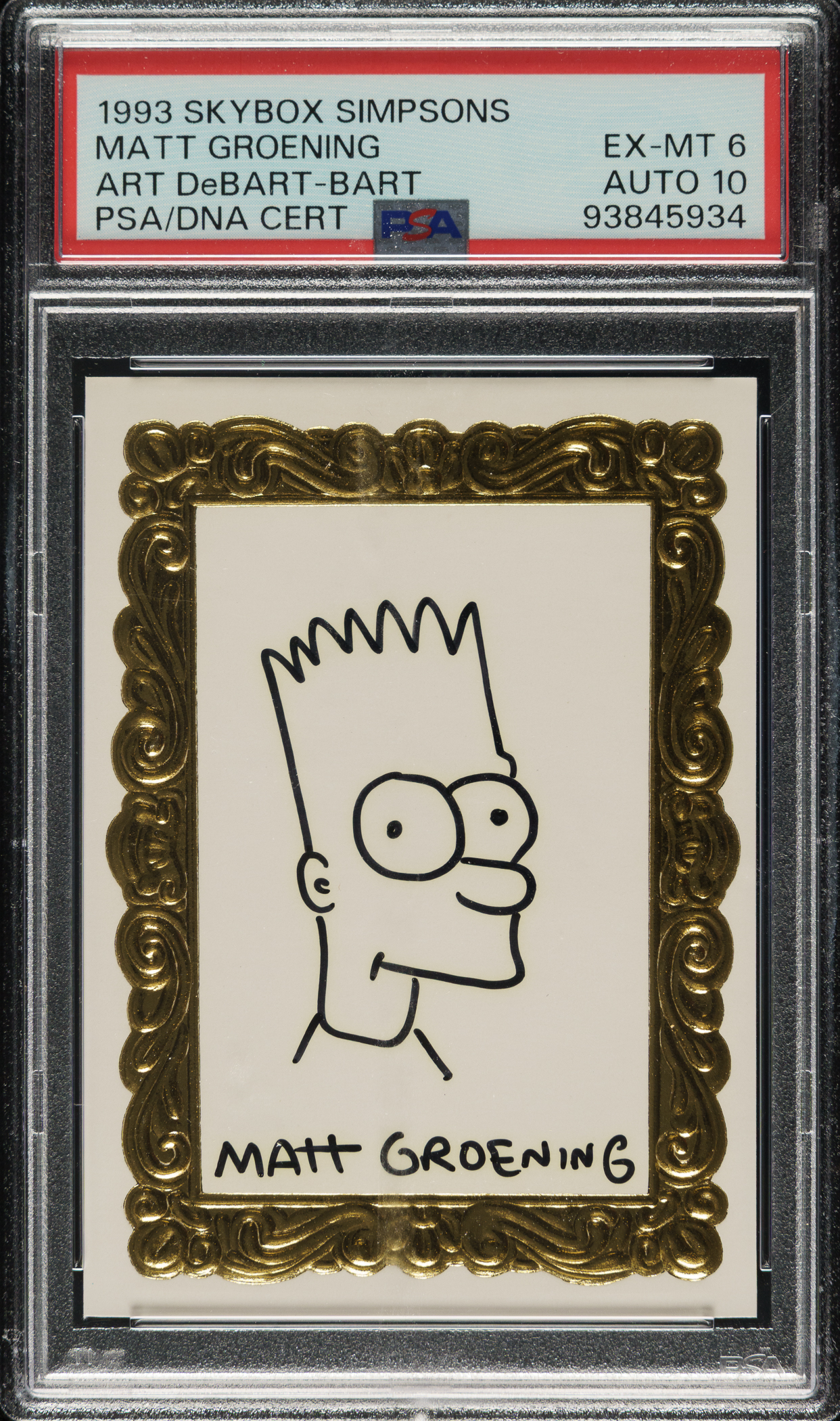 Extremely desirable "Art DeBart" sketch card from the 1993 Skybox Simpsons series. PSA/DNA has encapsulated the card, grading the signature GEM MINT 10 and the card EX-MT 6. The significance of this card cannot be overstated, as today the "Art DeBart" is often cited as the first mainstream sketch card. When SkyBox released the series in 1993, they randomly inserted 400 "It's Your Lucky Day" redemption cards into packs. If one were lucky enough to pull this redemption (approximately one per 9,000 packs), they could mail it back to Skybox for an "Art DeBart" sketch card, featuring a hand-drawn Bart Simpson sketch from the creator of The Simpsons, Matt Groening. Numbered 60/400 on the reverse. A magnificent rarity worthy of any world-class pop culture or The Simpsons collection.