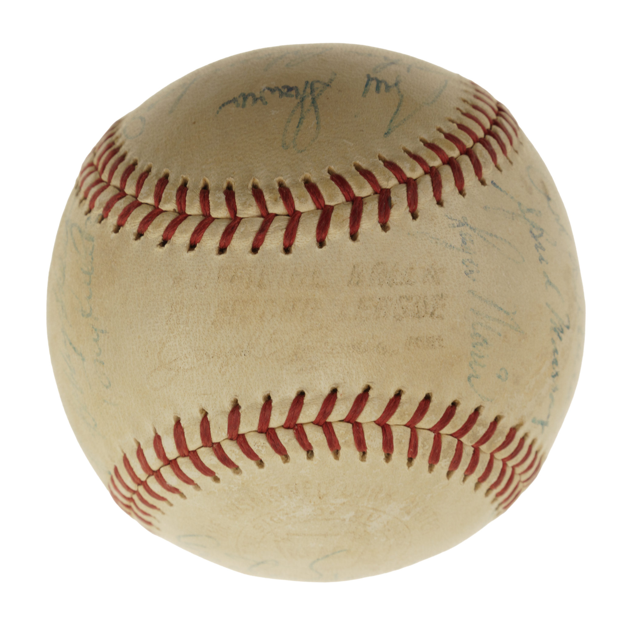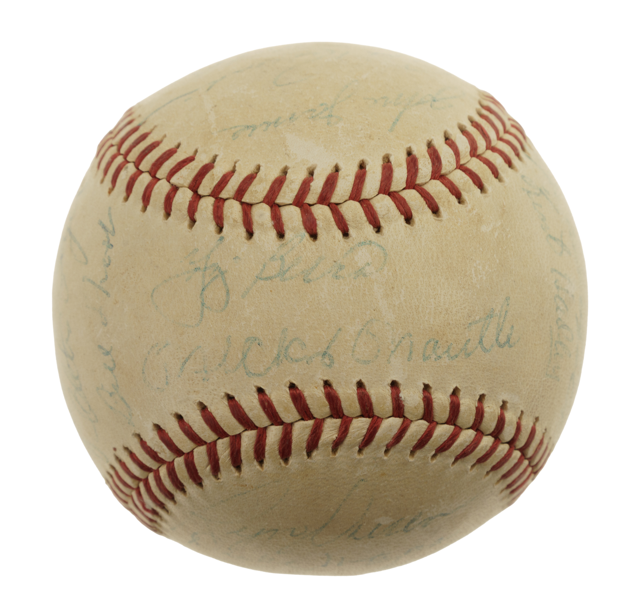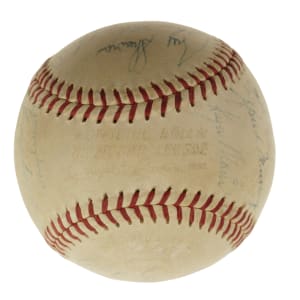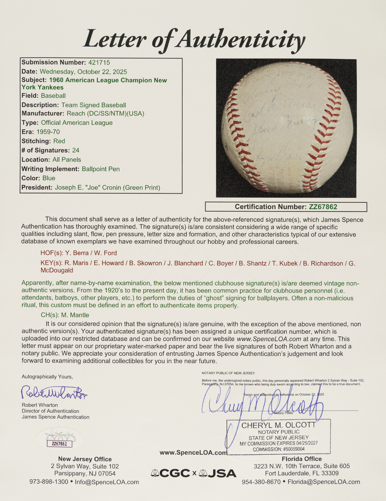 Official American League baseball (Cronin) signed in blue ink by 23 members of the 1960 American League Champion New York Yankees. Notable signatures include Berra (sweet spot), Howard, Terry, Skowron, Blanchard, Lopez, Boyer, Ford, Maris, Coates, Bobby Shantz, and Kubek. Please note that Mickey Mantle's signature has been deemed a clubhouse example by James Spence/JSA. The ball is lightly toned throughout and displays several tiny surface abrasions. Additionally, the manufacturer's stampings are largely faded (but legible). Good to Very Good condition overall.Full LOA from James Spence/JSA.