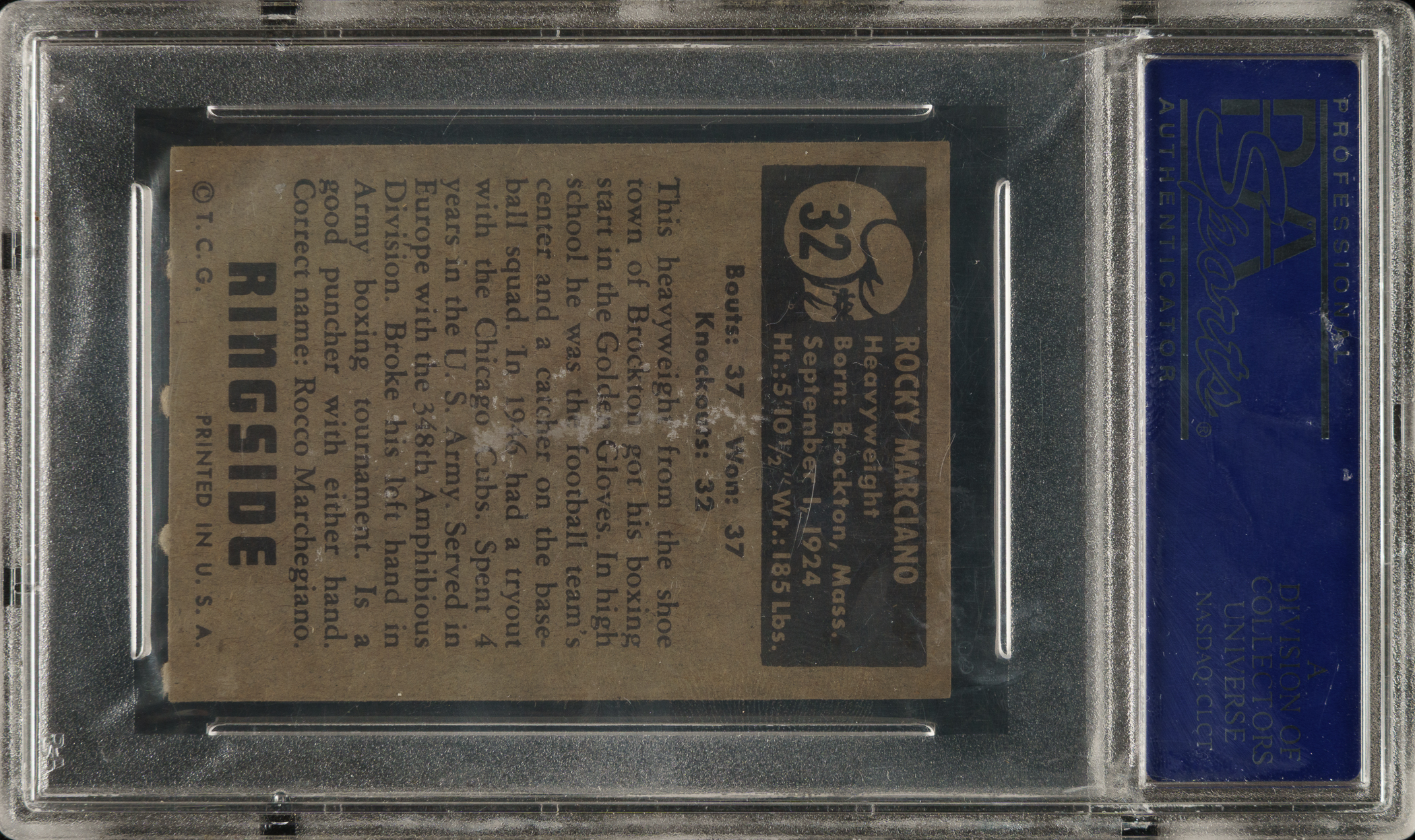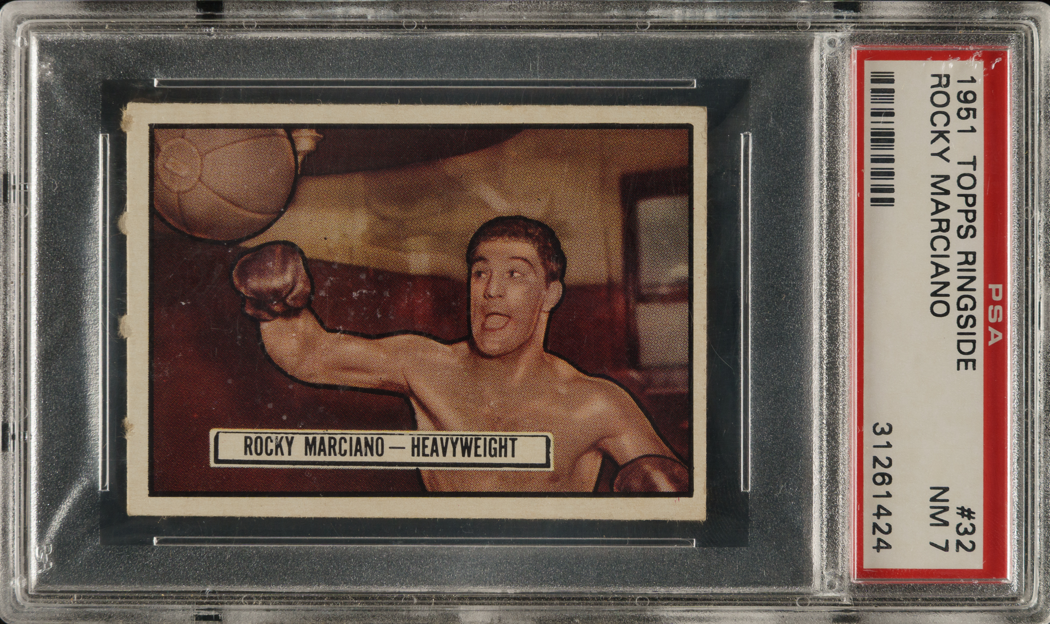 Graded NM 7 by PSA. High-grade example of one of the most famous and highly prized of all boxing cards: Hall of Famer Rocky Marciano in the 1951 Topps Ringside Boxing set. The 1951 Topps Marciano is one of the most popular and recognizable boxing cards from any era. Bright and crisp with strong corners, brilliant colors, centering toward the right, and a clean reverse with bold, crisp print. Marciano is the only heavyweight boxing champion in history to retire undefeated. Very attractive high-grade example of Marciano’s most classic and desirable card.
