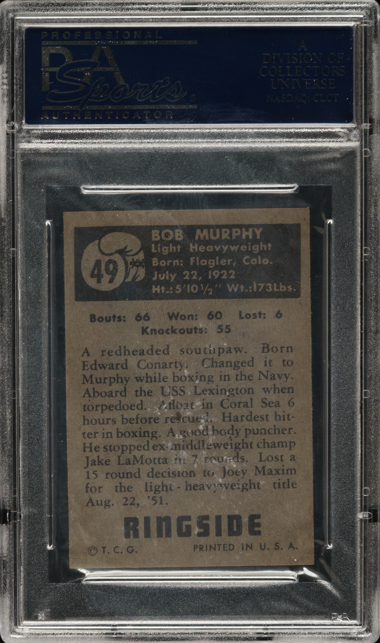 Graded NM-MT 8 by PSA. Only one example is graded higher. Extremely attractive high-grade example of #49 Bob Murphy from the popular 1951 Topps Ringside set. Murphy is a scarce short print that is rarely offered in high grade. The card is bright and crisp with bold colors, virtually flawless registration, four strong corners, and centered slightly to the bottom. The reverse is clean with bold black print. This is a very sharp high-grade card that would make a significant addition to any 1951 Topps Ringside set or vintage boxing-card collection.