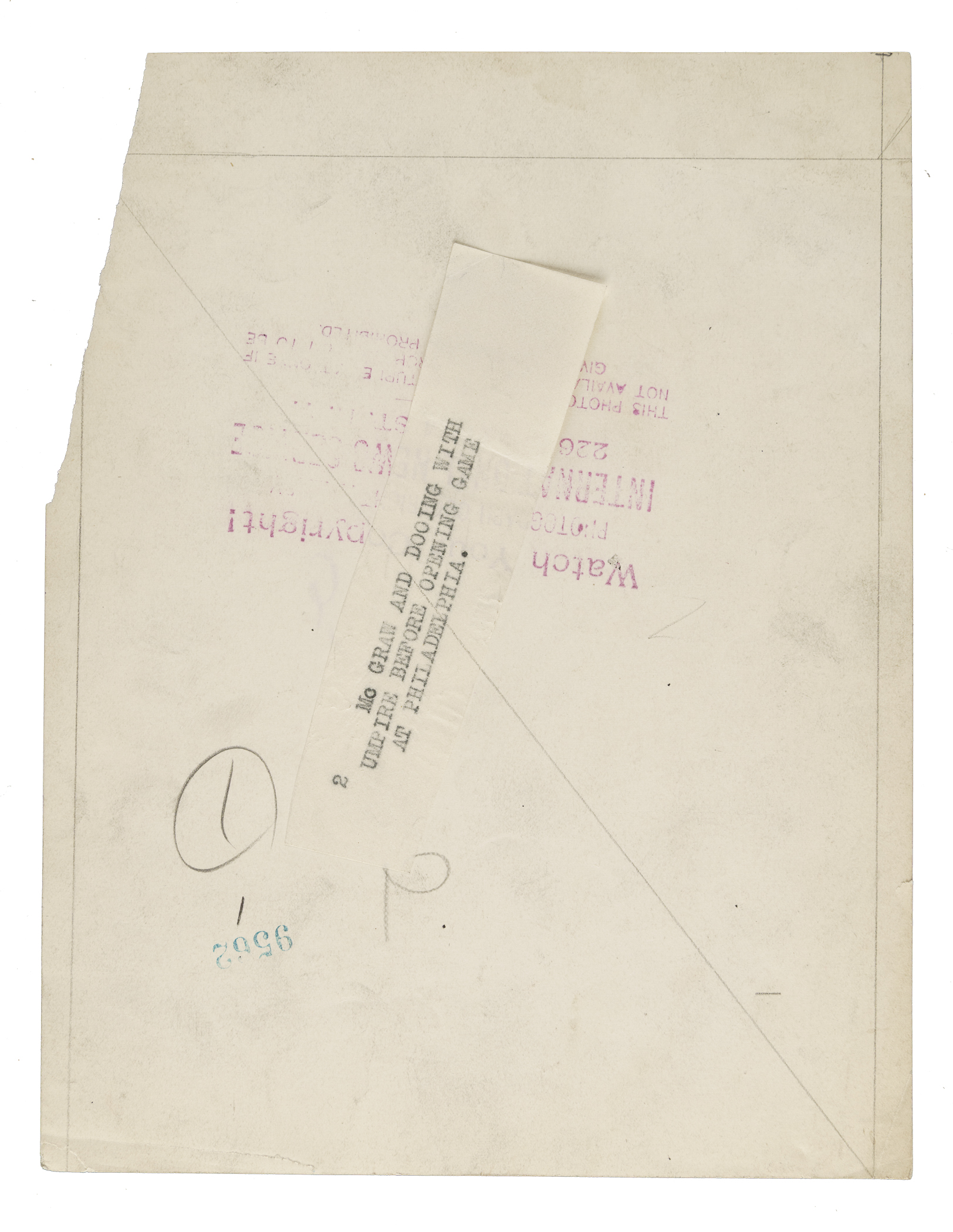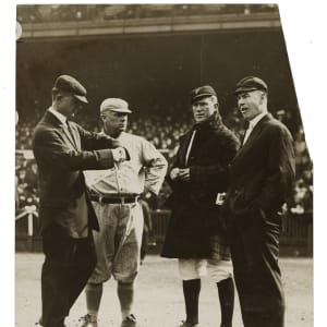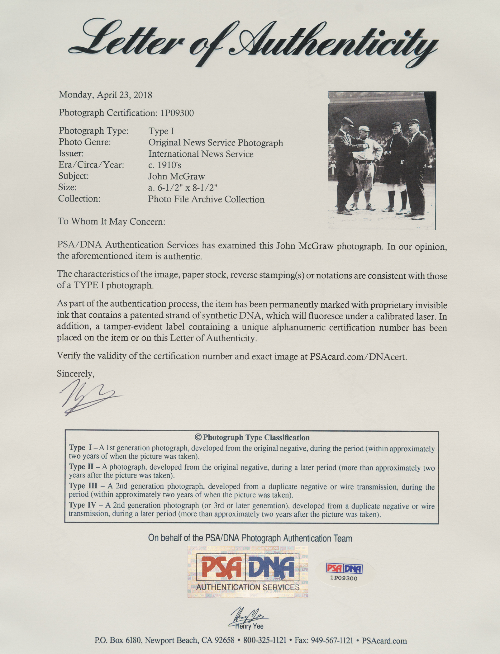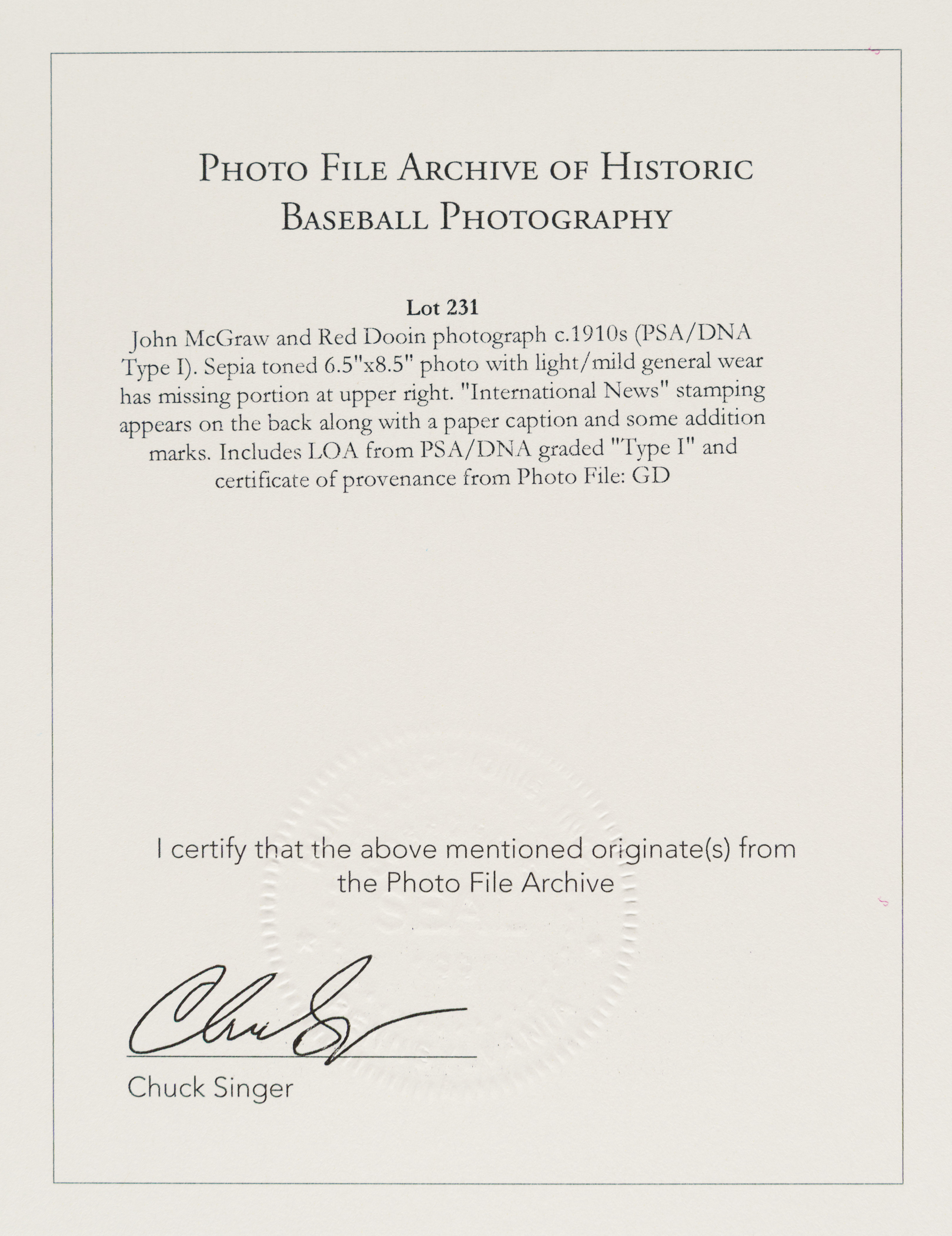 Original news photo of John McGraw as the manager of the New York Giants, circa 1910s. Certified as an original Type I photograph by PSA/DNA. McGraw is pictured having a conversation with Red Dooin (manager of the Philadelphia Phillies) and a pair of umpires. The reverse bears an "International News Service" credit stamp, a paper caption, and a few editorial markings. The photo (6.5 x 8.5 inches) is missing a portion along the right edge and is in Poor condition overall. Full LOA from PSA/DNA.