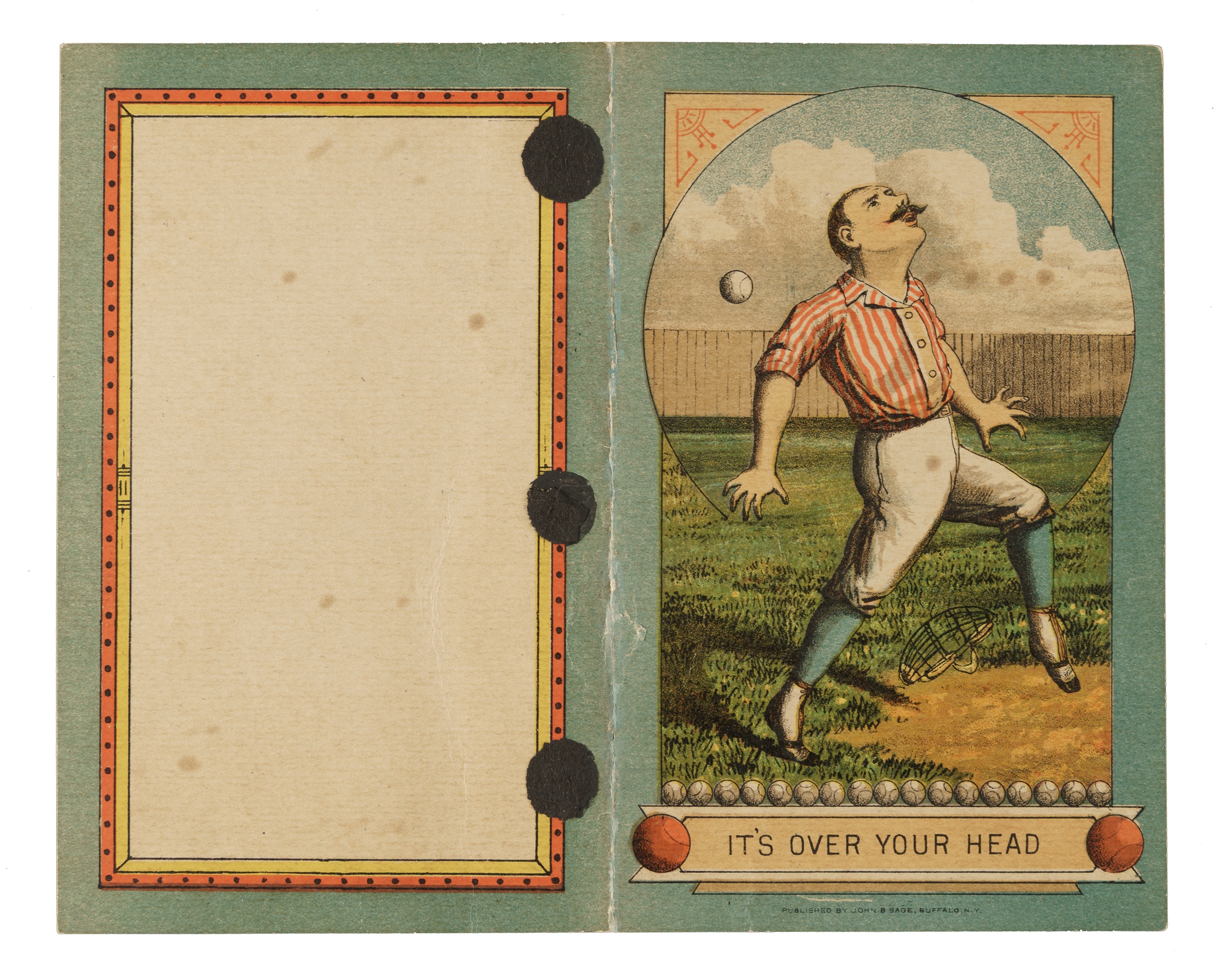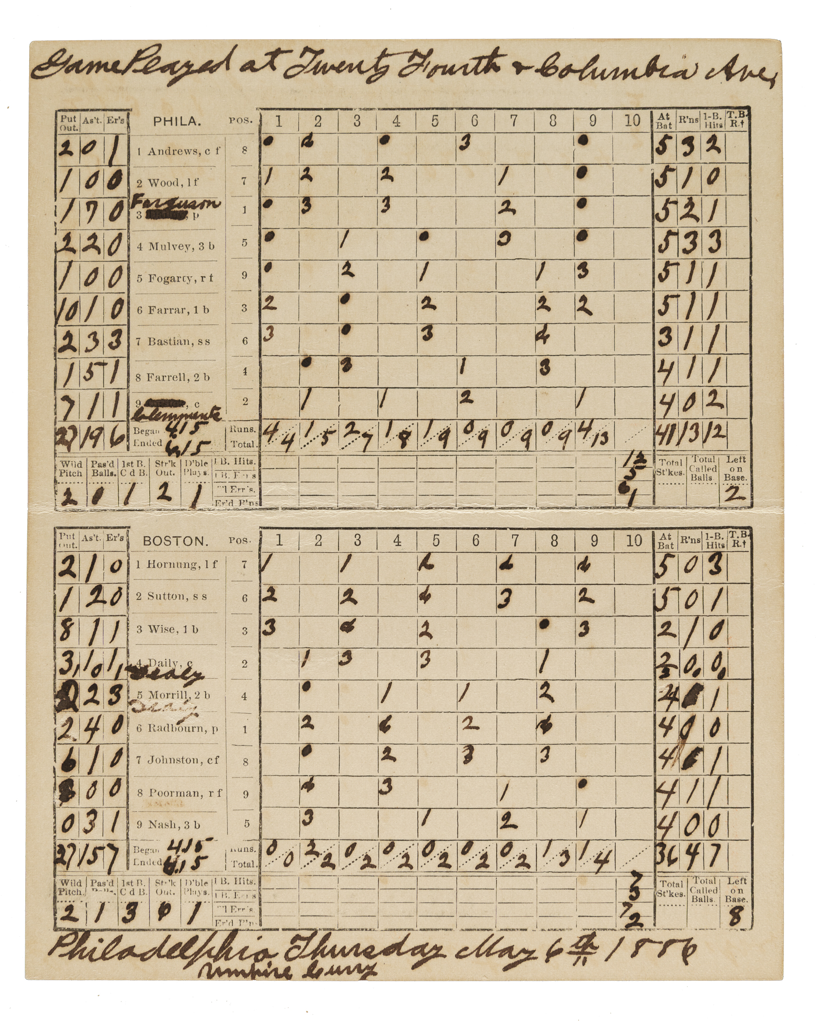 This fold-over scorecard, issued for an 1887 National League game between the Philadelphia Phillies and Boston Beaneaters at Philadelphia’s Recreation Park, features a colorful image of a generic ballplayer in uniform on the cover, below which is the printed caption "It's Over Your Head." The preprinted lineups include Ferguson, Andrews, Mulvey, Bastian, and Fogarty for Philadelphia, and Radbourn, Nash, Wise, Sutton, and Hornung for Boston. Neatly scored in black ink to record a 13-4 Philadelphia win. The date, "May 6th 1886" is written in black ink along the bottom of the scoring side and research confirms that this game took place on that date. The scorecard (5-7/8 x 7-1/4 inches, unfolded) displays a few light-to-moderate creases. In Very Good condition overall.