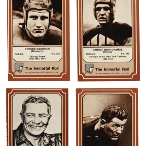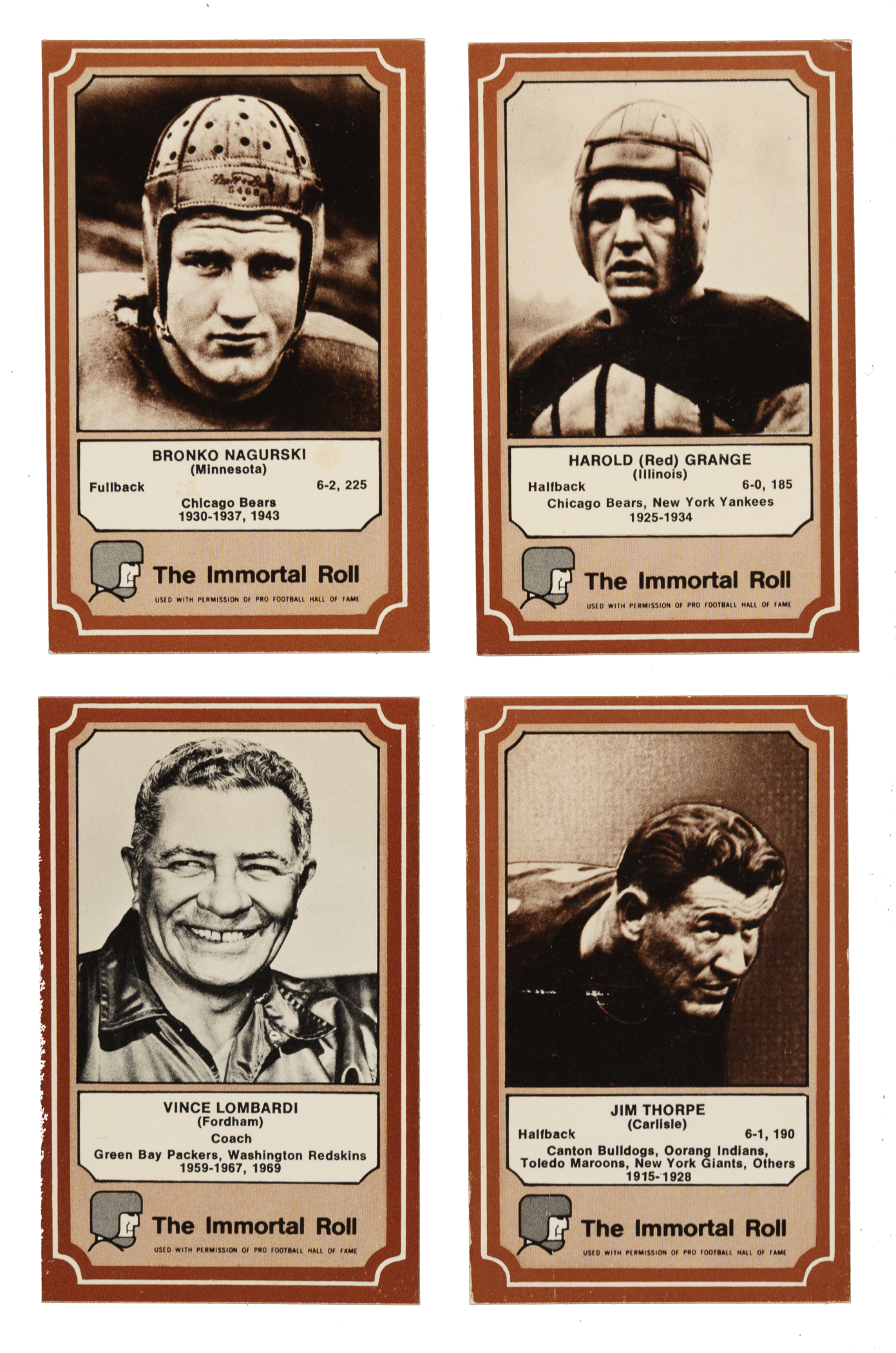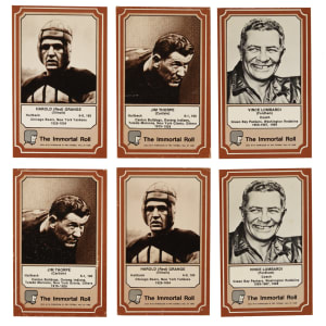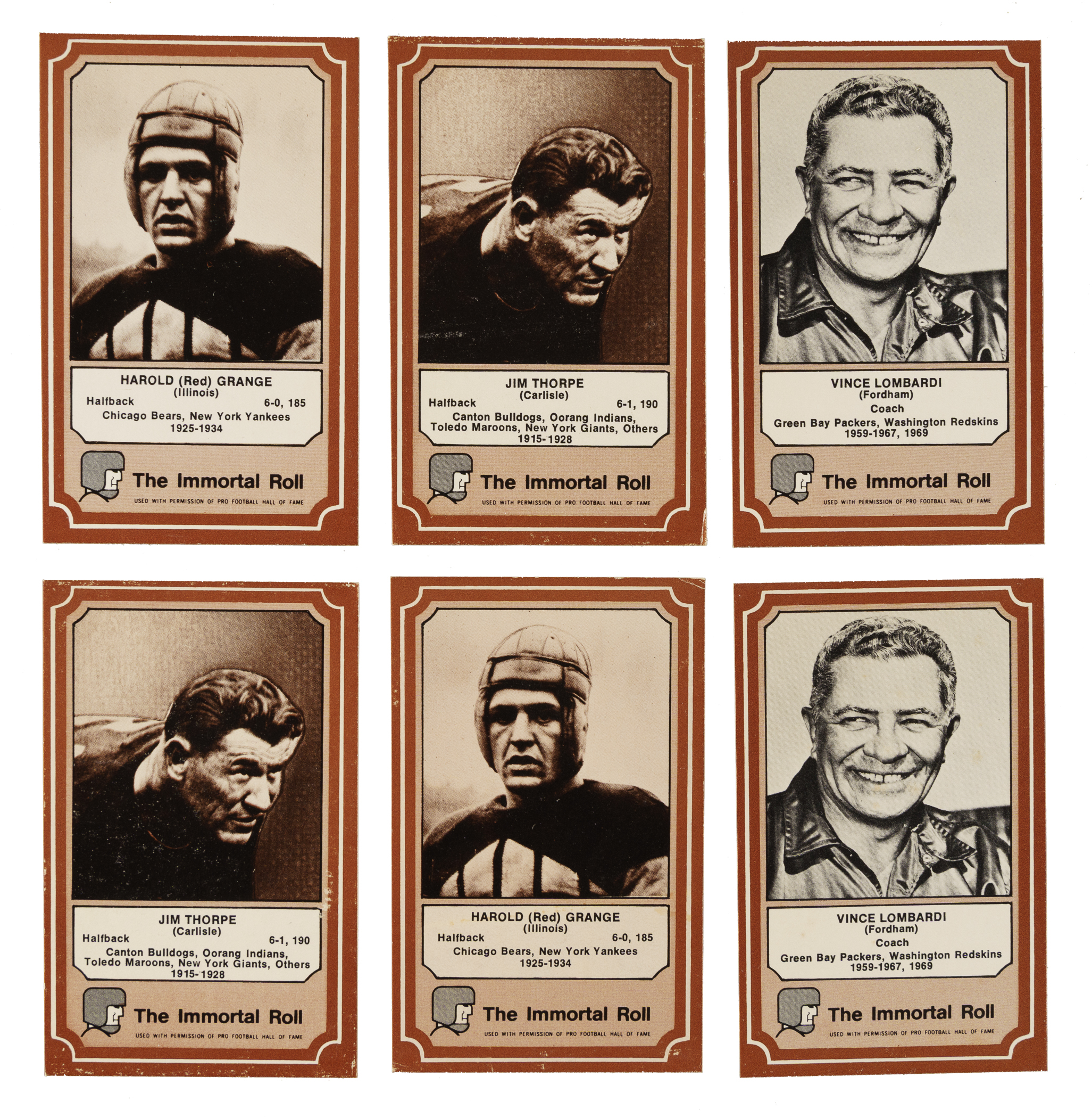 The 1975 Fleer "Immortal Roll" football set, which is composed of eighty-four cards, features only Hall of Fame members and was the first such set to be sold at the Pro Football Hall of Fame in Canton, Ohio. Presented is a mid- to high-grade collection of one near-complete (minus two cards) and two complete sets. This collection consists of the following: 1) Complete Set (84): Condition ranges from Ex to Nr/Mt-Mt (averaging Ex-Mt+), with a couple Vg-Ex. Keys: #1 Thorpe (Vg-Ex), 4 Grange (Ex+), and 32 Lombardi (Ex-Mt+). 2) Complete Set (84): Condition is 90% ranging from Ex to Nr/Mt-Mt (averaging Ex-Mt), with 10% Vg to Vg-Ex. Keys: #1 Thorpe (Vg+), 4 Grange (Vg-Ex), and 32 Lombardi (Ex-Mt). 3) Near-Complete Set (82/84): Condition is 90% ranging from Ex to Nr/Mt-Mt (averaging Ex-Mt), with 10% Vg to Vg-Ex. Missing #5 and 7 Halas for completion. Keys: #1 Thorpe (Vg), 4 Grange (Vg), and 32 Lombardi (Ex). Total: 250 cards. The size/weight of this item requires that there will be an additional shipping charge for this lot.