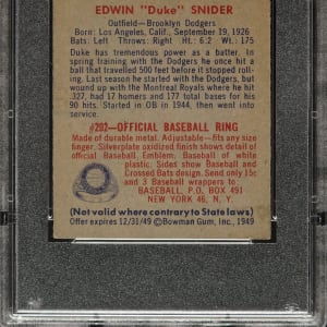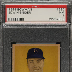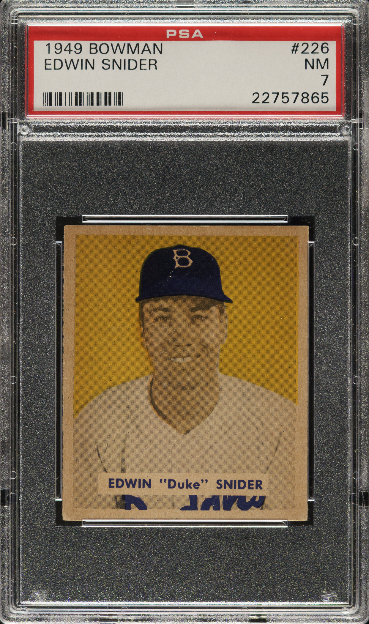 Graded NM 7 by PSA. High-grade example of one of postwar collecting's most popular rookie cards featuring Hall of Famer Duke Snider of the Brooklyn Dodgers. This card has bright colors, a crisp image, and light corner wear. Clean reverse. 1949 Bowmans in general are rarely found in such high grade, primarily because they so often have naturally soft corners due to the paper stock on which they are printed. This is a high-grade example of Duke Snider’s first gum card and one of the key rare high-number cards of the classic 1949 Bowman set.