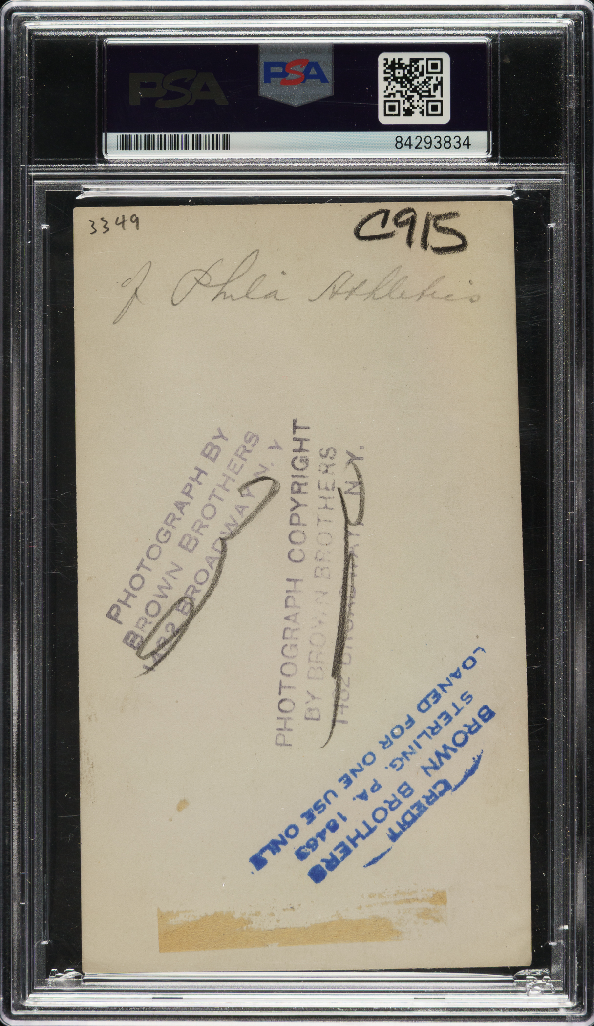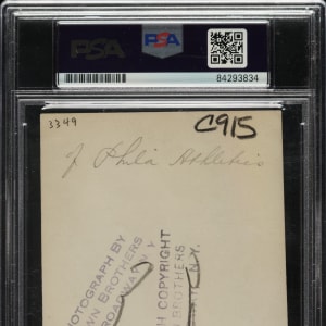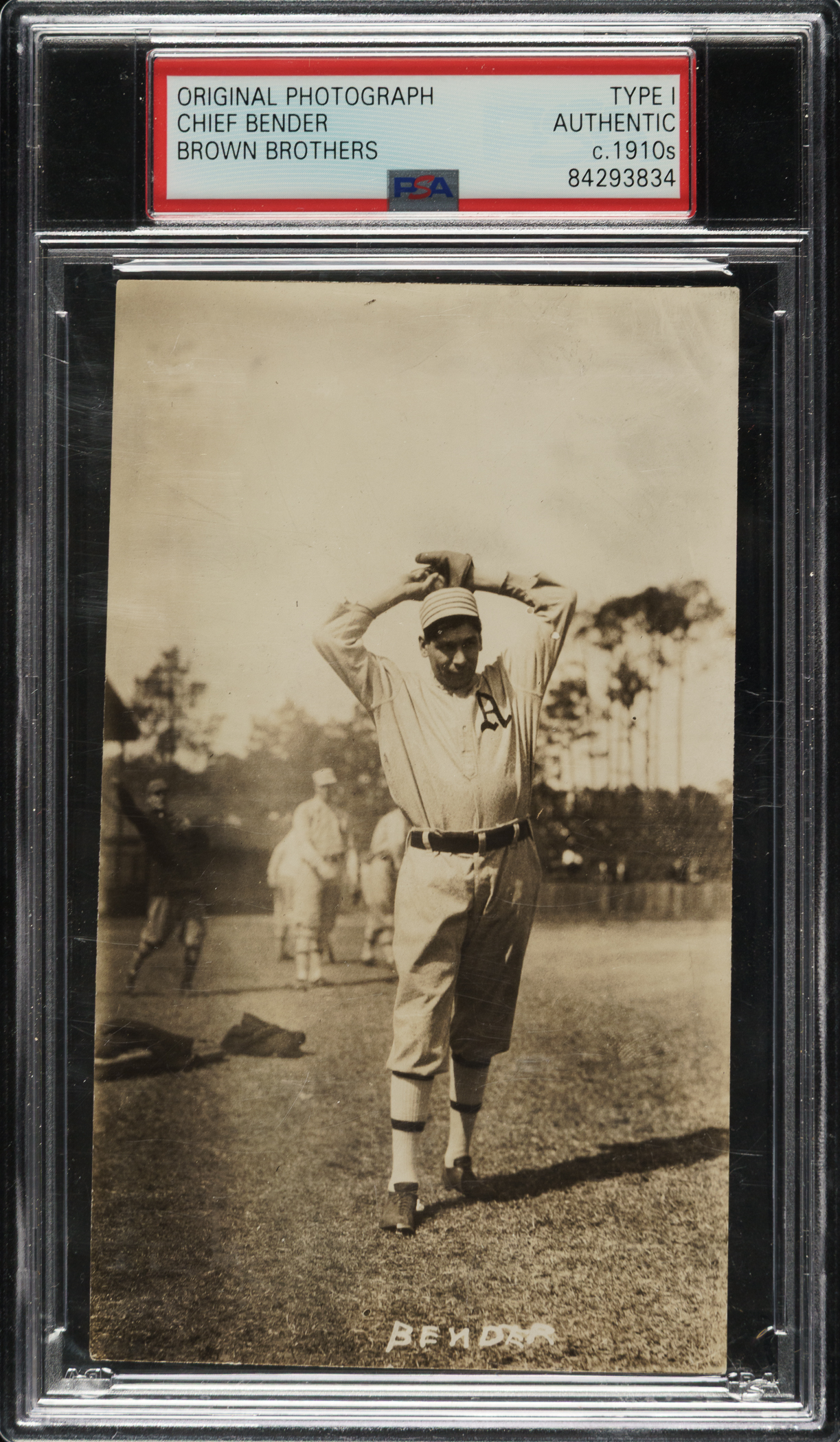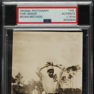 Original news photo of Chief Bender as a member of the Philadelphia Athletics, circa 1910s. Encapsulated and certified as an original Type I photograph by PSA/DNA. Bender is captured in a windup pose during spring training. Three "Brown Bros." credit stamps appear on the reverse, along with a strip of added paper and editorial notations. The name "Bender" was etched into the original negative and appears on the photo in white lettering along the bottom edge. The photo (3-1/8 x 5-3/8 inches) is in Excellent condition overall.