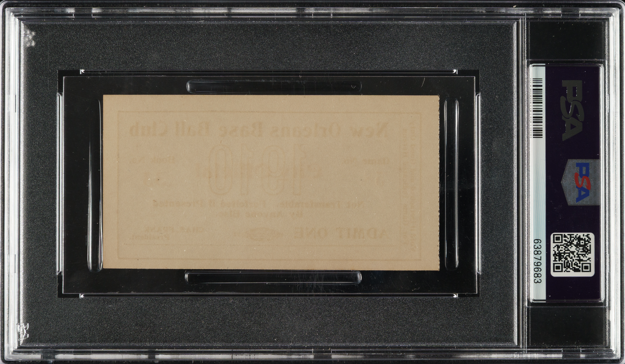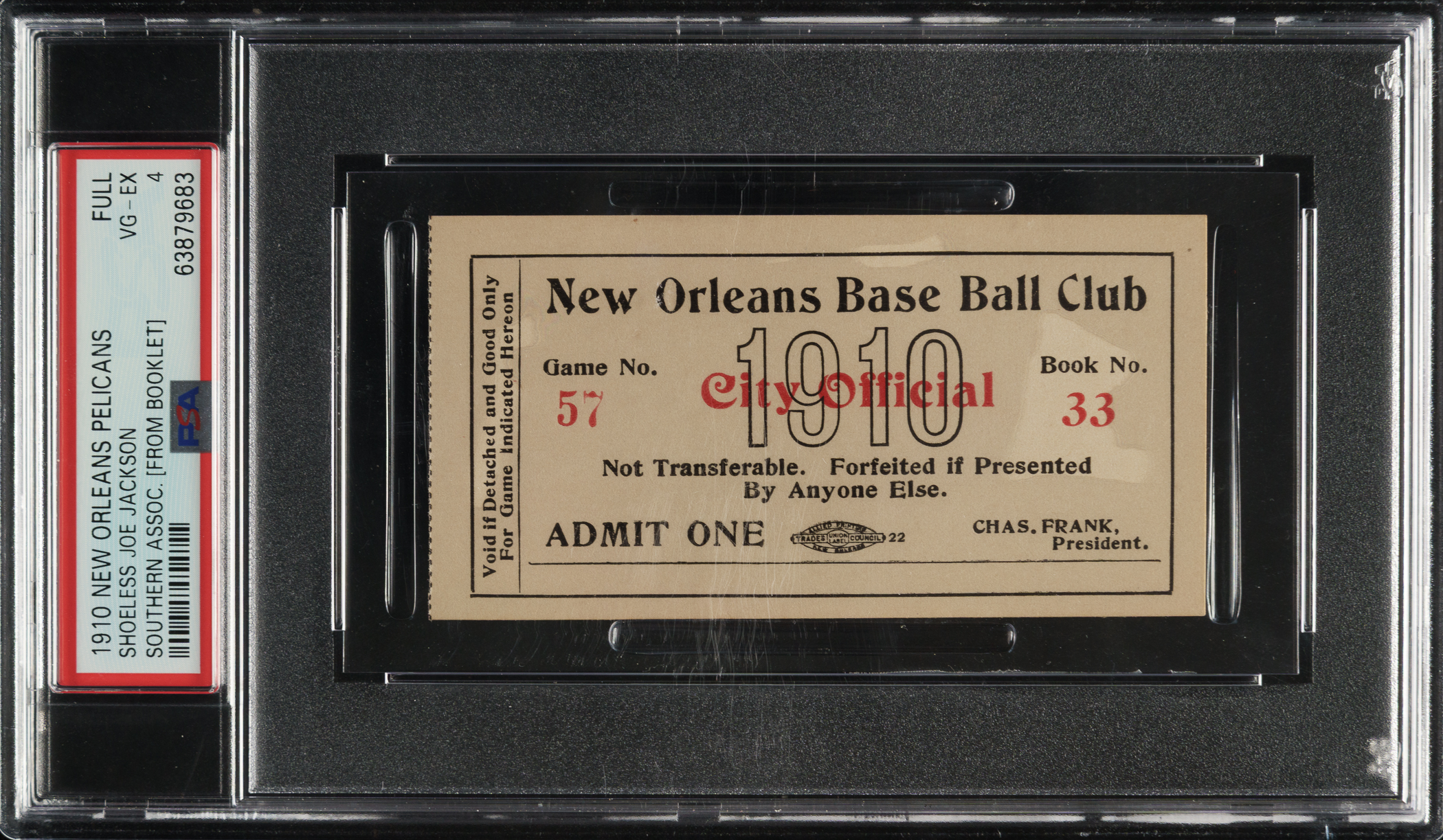 Full ticket issued by the New Orleans Base Ball Club for the season of 1910. Graded VG-EX 4 by PSA. This ticket is significant today because it would have granted the bearer the opportunity to watch a young outfielder for the New Orleans Pelicans by the name of Joe Jackson. 1910 marked the only season "Shoeless Joe" was with New Orleans, and it was certainly a memorable one as he led the Southern Association in batting average (.354), hits (165), and runs (82). The ticket (3.75 x 2 inches), issued for "Game No. 57," has a light crease in the lower left.