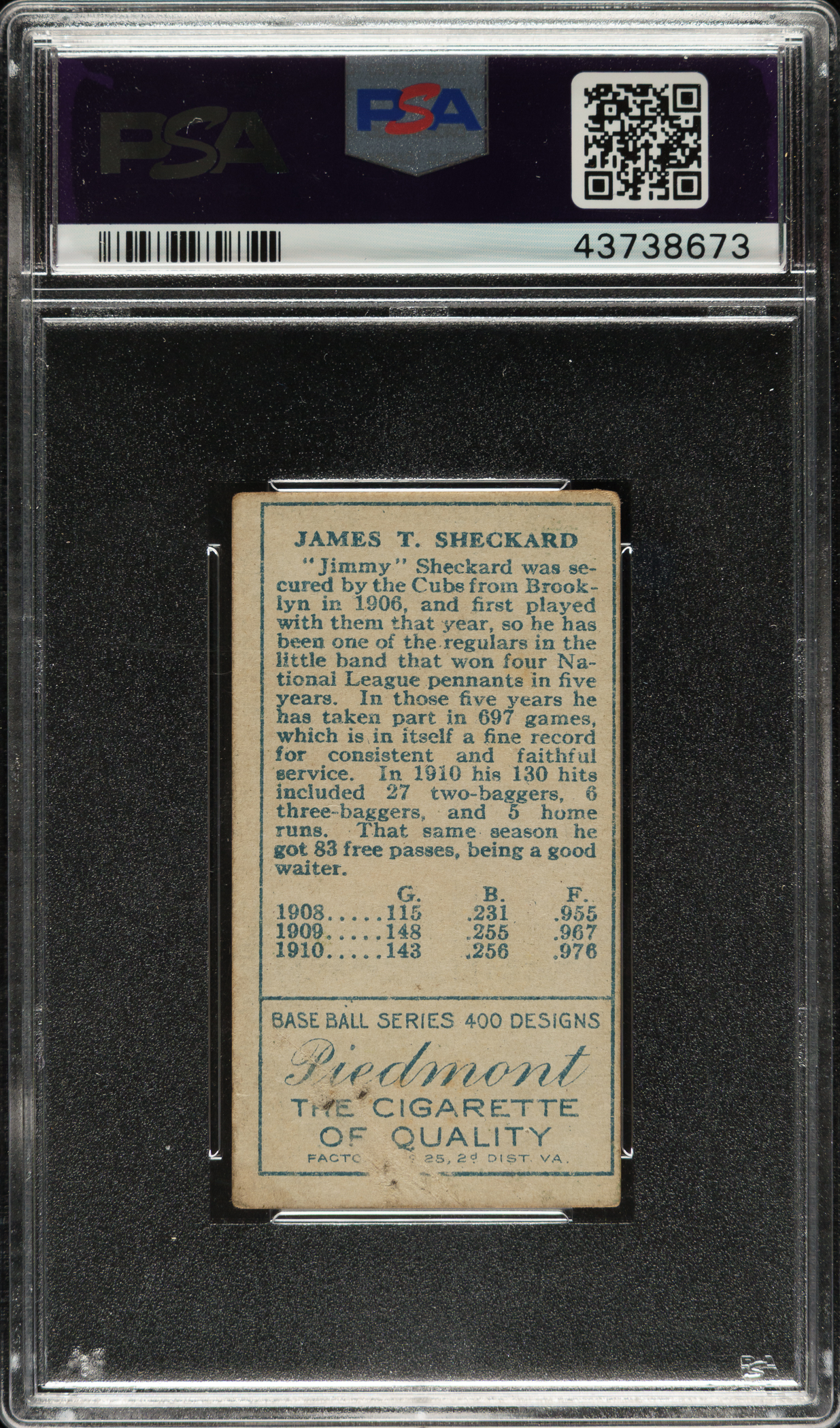 Lot # 1627: 1911 T205 Gold Border Jimmy Sheckard PSA VG+ 3.5
