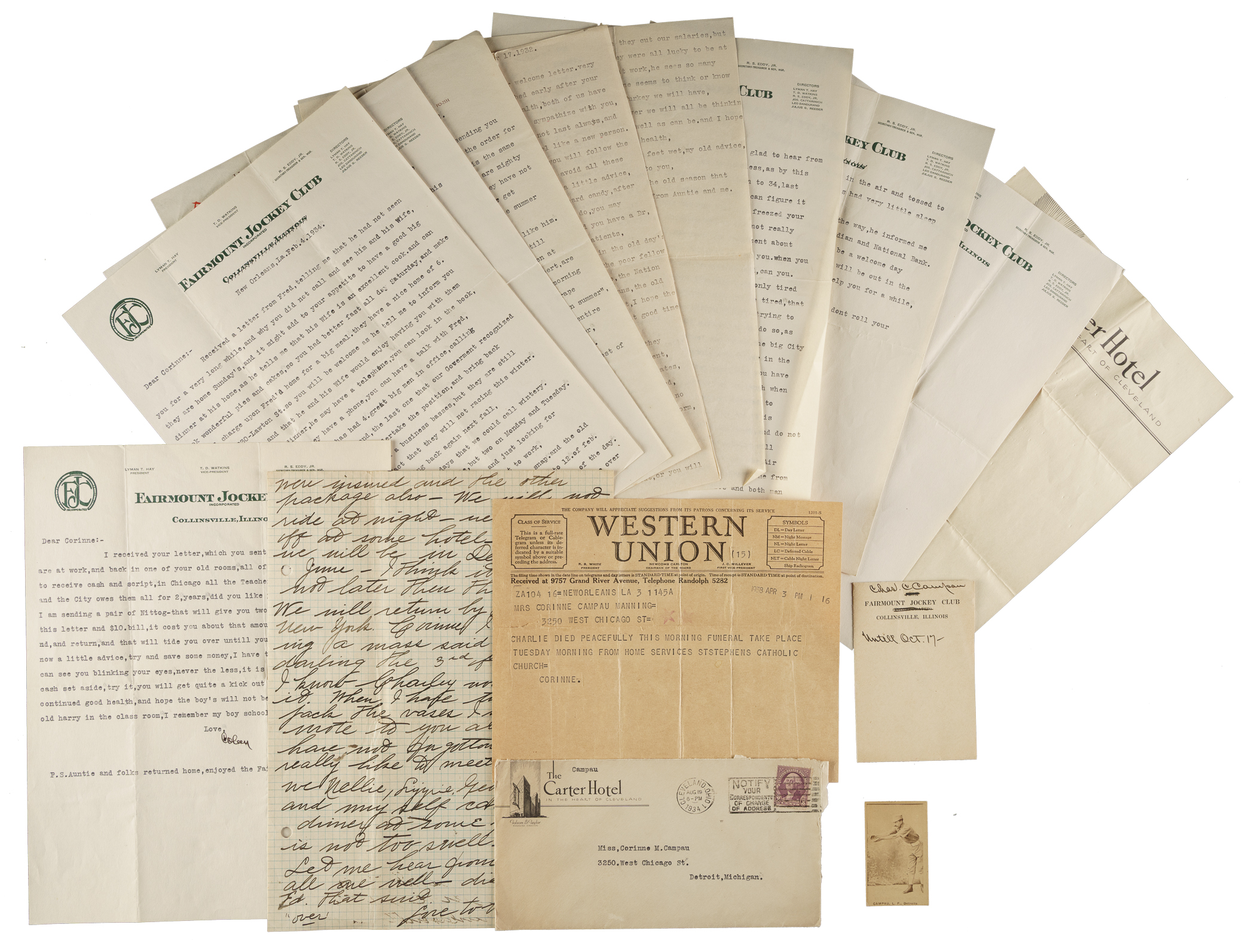 Presented is an archive of items related to outfielder Charles "Count" Campeau. While Campau spent the majority of his lengthy career in the minors, his 1890 season with the St. Louis Browns of the American Association (considered a major league) was one for the record books. In addition to leading the circuit with nine home runs, Campau logged 15 consecutive multi-hit games, a major league record that stands to this day. This collection consists of xxx items, including xxx signed by Campau. 1-5) Five Typed Letters From Campau. All five letters are addressed to "Corrine," who appears to be Campau's niece.Three are on Fairmount Jockey Club stationery, one is on Havana-American Jockey Club stationery, and the other is on plain white paper. Four are signed "Uncle," while the other has an unidentifiable signature. Condition ranges from Gd to Ex. 6) Cut from an envelope signed by Campeau. Condition is Vg-Ex. 7) N172 Old Judge (#62-3 pose). Trimmed with back damage. Pr. 8) Handwritten letter. Appears to be signed "Aunty" (Campeau's wife). Condition is Vg. Total: 8 items. Auction LOA from James Spence/JSA.