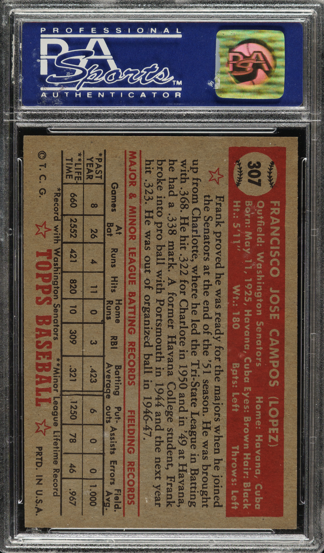 Graded NM-MT 8 by PSA. Frank Campos of the Washington Senators.