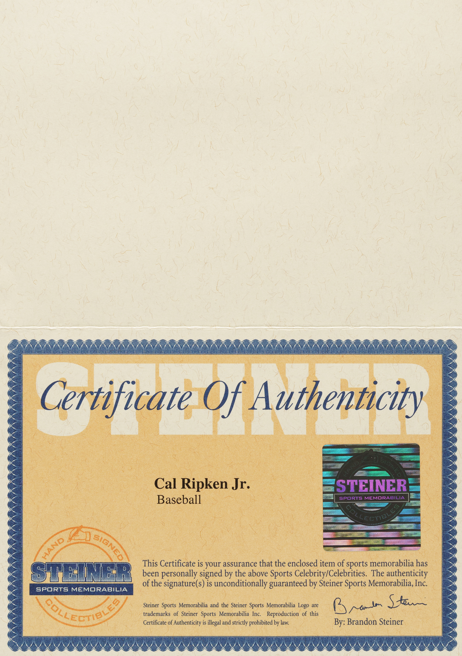 Baltimore Orioles Hall of Famer Cal Ripken Jr. signed baseball. MLB certification sticker is affixed to the baseball. COA from Steiner.