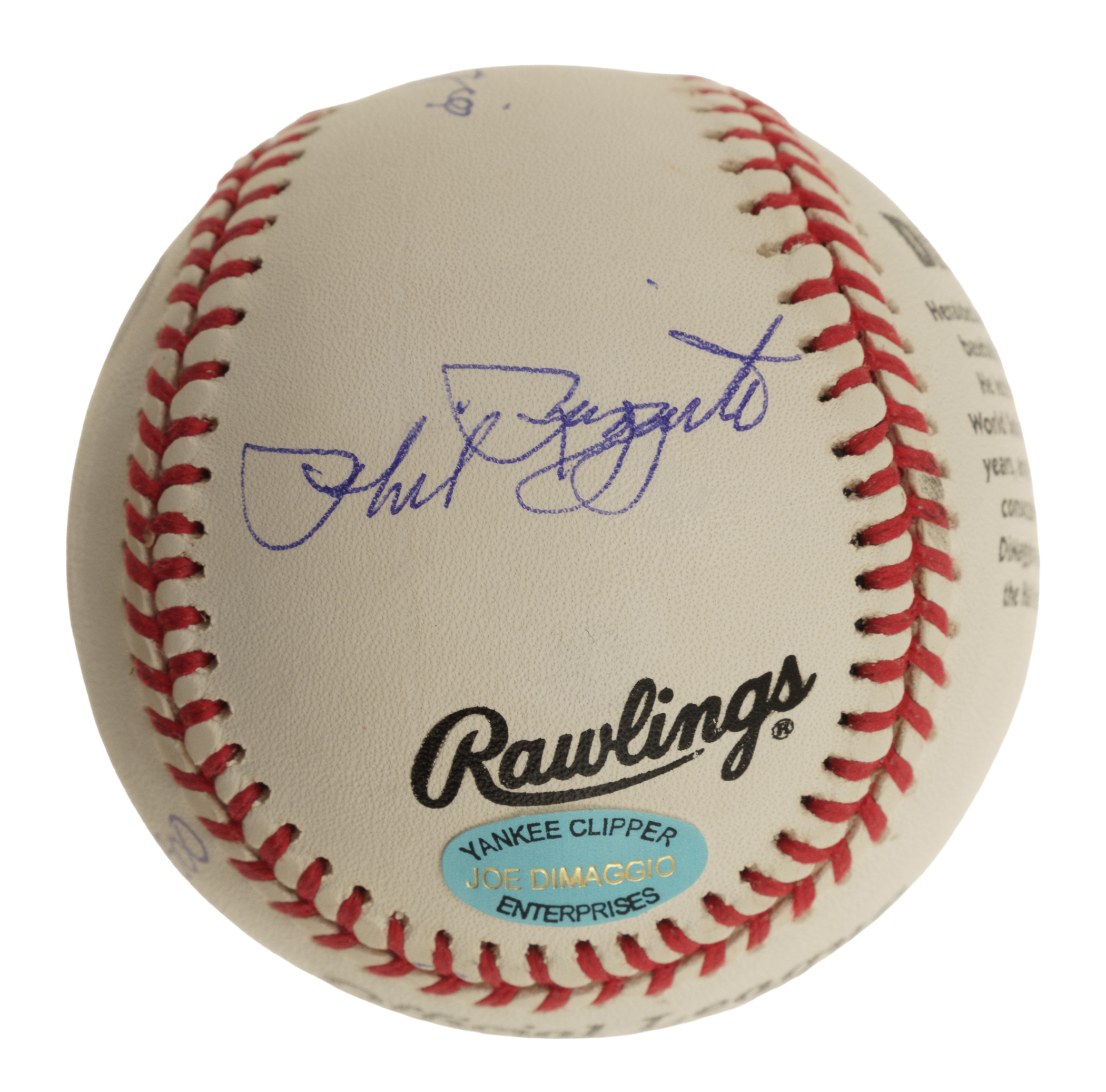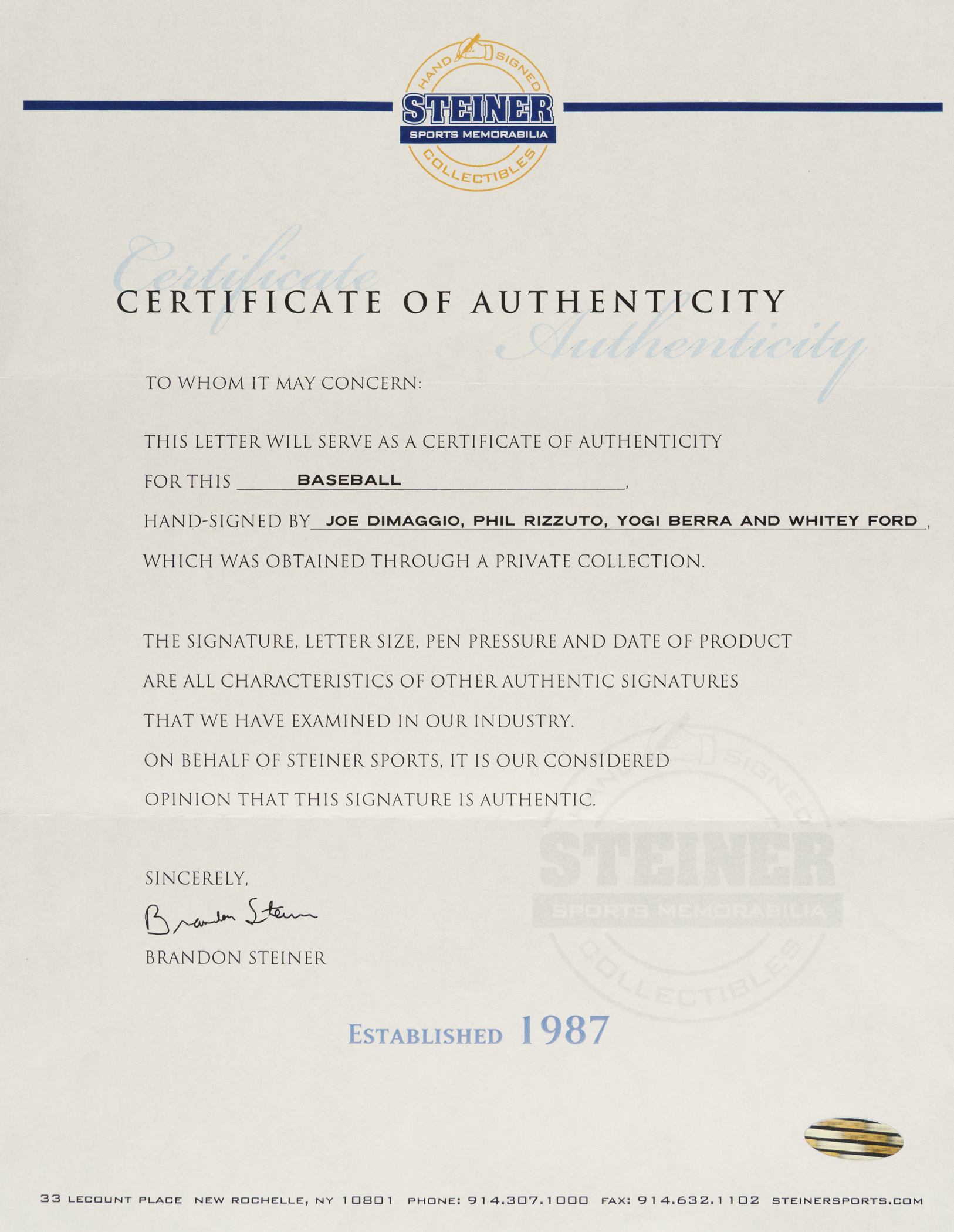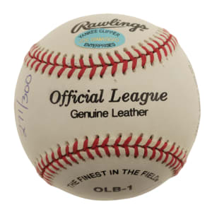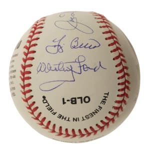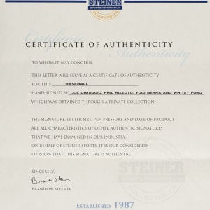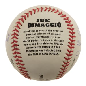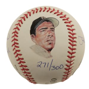 New York Yankees Hall of Famers Joe DiMaggio, Yogi Berra, Whitey Ford and Phil Rizzuto multi-signed baseball. This baseball is numbered 271 out of 300. COA from Steiner. Auction LOA from James Spence/JSA.