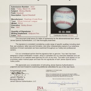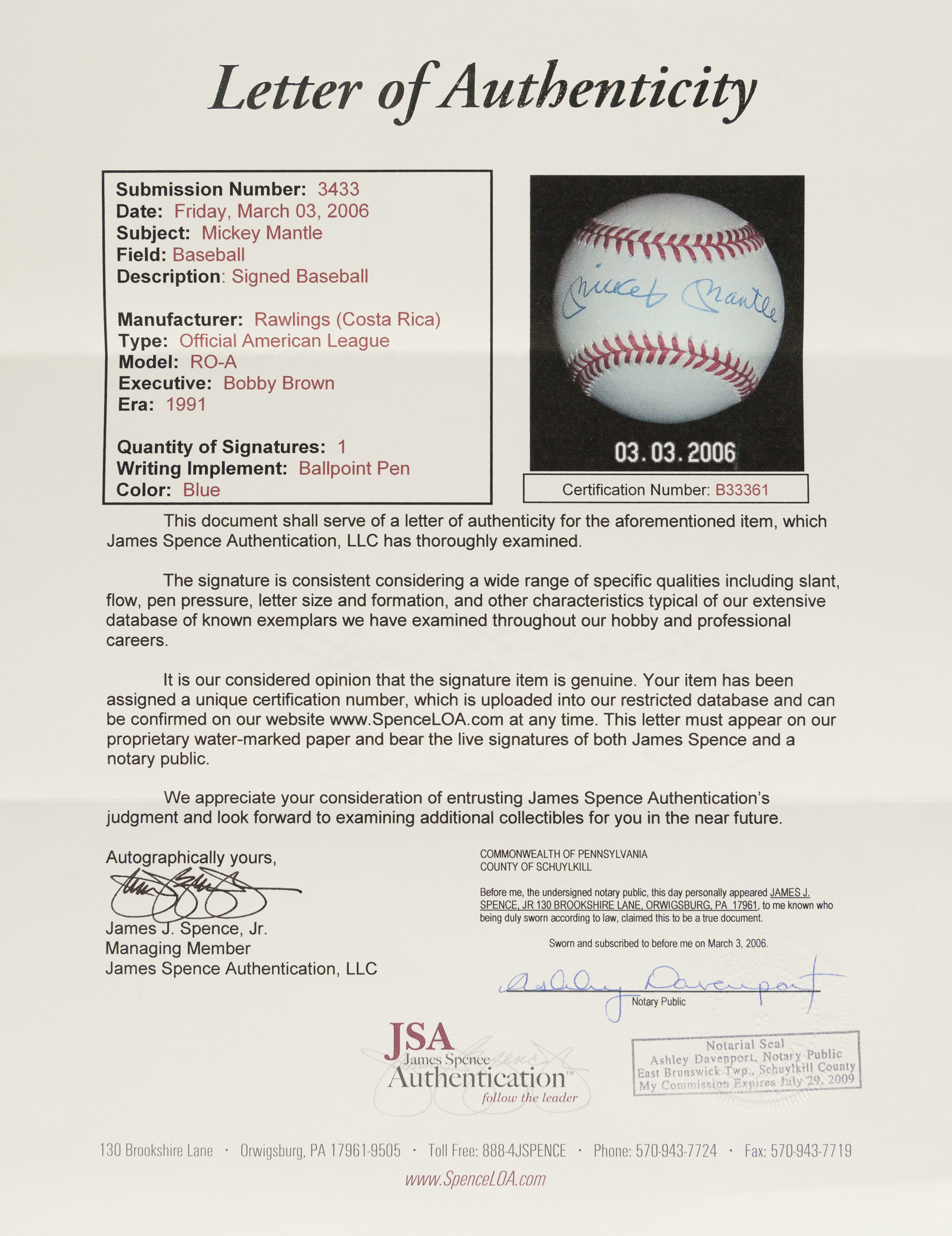 New York Yankees Hall of Famer Mickey Mantle signed baseball. Full LOA from James Spence/JSA.