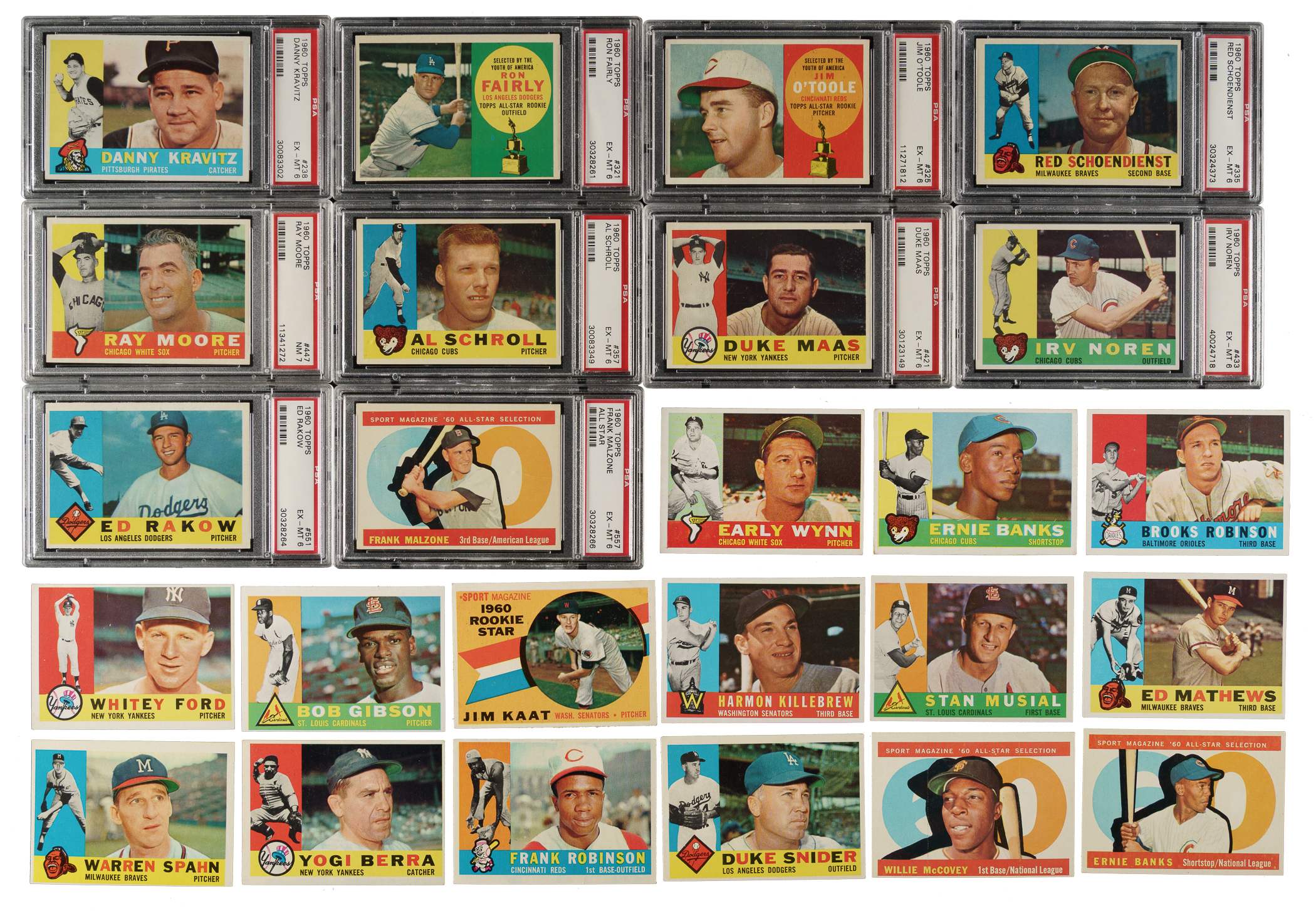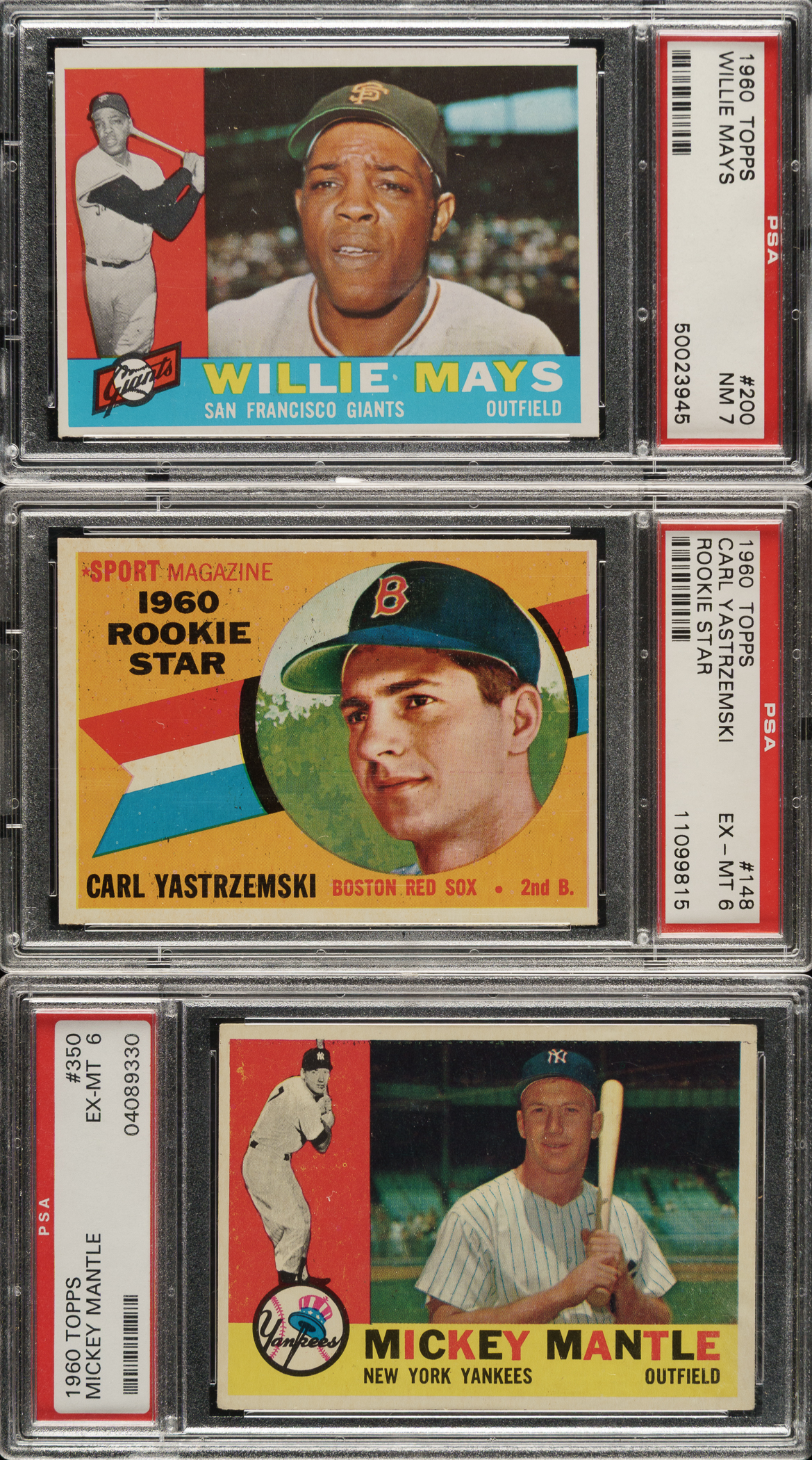 Presented is a complete set of 1960 Topps baseball, which was Topps' last horizontal issue, highlighted by the rookie cards of Hall of Famers Carl Yastrzemski and Willie McCovey. Many of the biggest stars in the set, including Mantle, Mays, and Aaron, appear in the set more than once due to the All-Star card series. Mantle has three cards in this set, as he also appears on the #160 "Rival All-Stars" card with Ken Boyer. Condition is 14% Ex-Mt to Nr/Mt, 67% Vg-Ex to Ex, and 19% Gd to Vg (including a few lesser). Forty-one cards have been professionally graded and encapsulated by PSA. Keys: #1 Wynn (Vg), 10 Banks (Vg), 28 B. Robinson (Ex), 35 Ford (Vg-Ex), 50 Kaline (NM 7), 73 Gibson (90/10 T/B, otherwise Ex), 136 Kaat RC (Vg-Ex), 148 Yastrzemski RC (EX-MT 6), 160 Mantle/Boyer (NM 7), 200 Mays (NM 7), 210 Killebrew (Nr/Mt), 250 Musial (Vg-Ex), 300 Aaron (EX-MT 6), 316 McCovey RC (EX-MT 6), 326 Clemente (EX-MT 6), 332 Yankees Team (NM 7), 335 Schoendienst (EX-MT 6), 343 Koufax (EX-MT 6), 350 Mantle (EX-MT 6), 377 Maris (EX-MT 6), 420 Mathews (Vg-Ex), 445 Spahn (95/5 T/B, otherwise Ex+), 475 Drysdale (EX-MT 6), 480 Berra (Vg+), 490 F. Robinson (Vg), 493 Snider (Vg), 554 McCovey AS (85/15 T/B, otherwise Ex), 560 Banks AS (erasure marks on front, otherwise Ex), 563 Mantle AS (NM 7), 564 Mays AS (EX-MT 6), 565 Maris AS (EX-MT 6), and 566 Aaron AS (EX-MT 6). Twenty-four additional PSA-graded cards: NM 7 (6 cards): #13, 137, 217, 233, 259, and 447. EX-MT 6 (18 cards): #2, 7, 37, 108, 115, 169, 175, 207, 231, 238, 293, 321, 325, 357, 421, 433, 551, and 557. This is a highly attractive mid- to high-grade complete set which, in addition to all the special cards and scarce high numbers (#507-572), is loaded with Hall of Famers and stars from the 1960s. The SMR value for just the 41 PSA-graded cards is $5,889. Total: 572 cards. The size/weight of this item requires that there will be an additional shipping charge for this lot.
