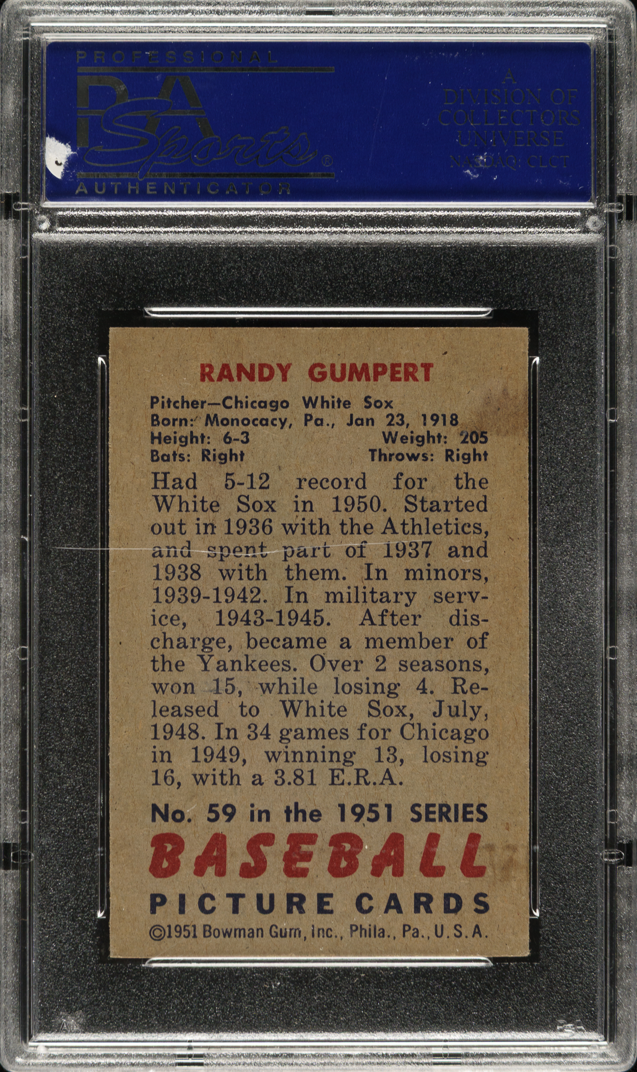 Lot # 2482: 1951 Bowman #59 Randy Gumpert PSA NM-MT 8
