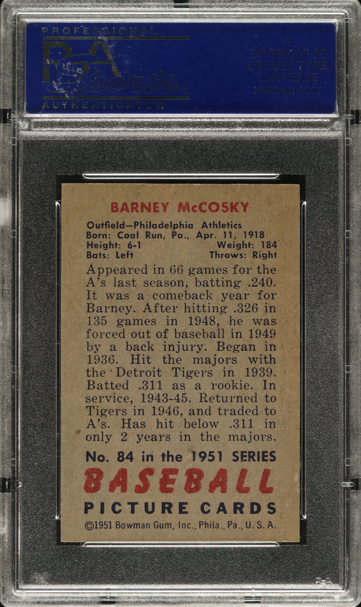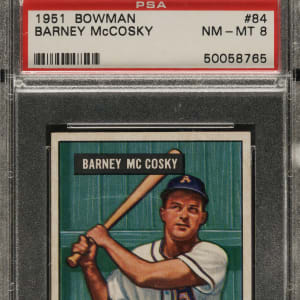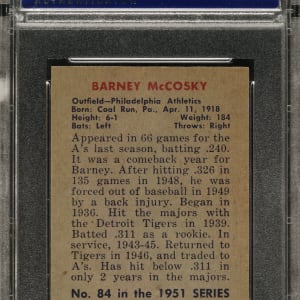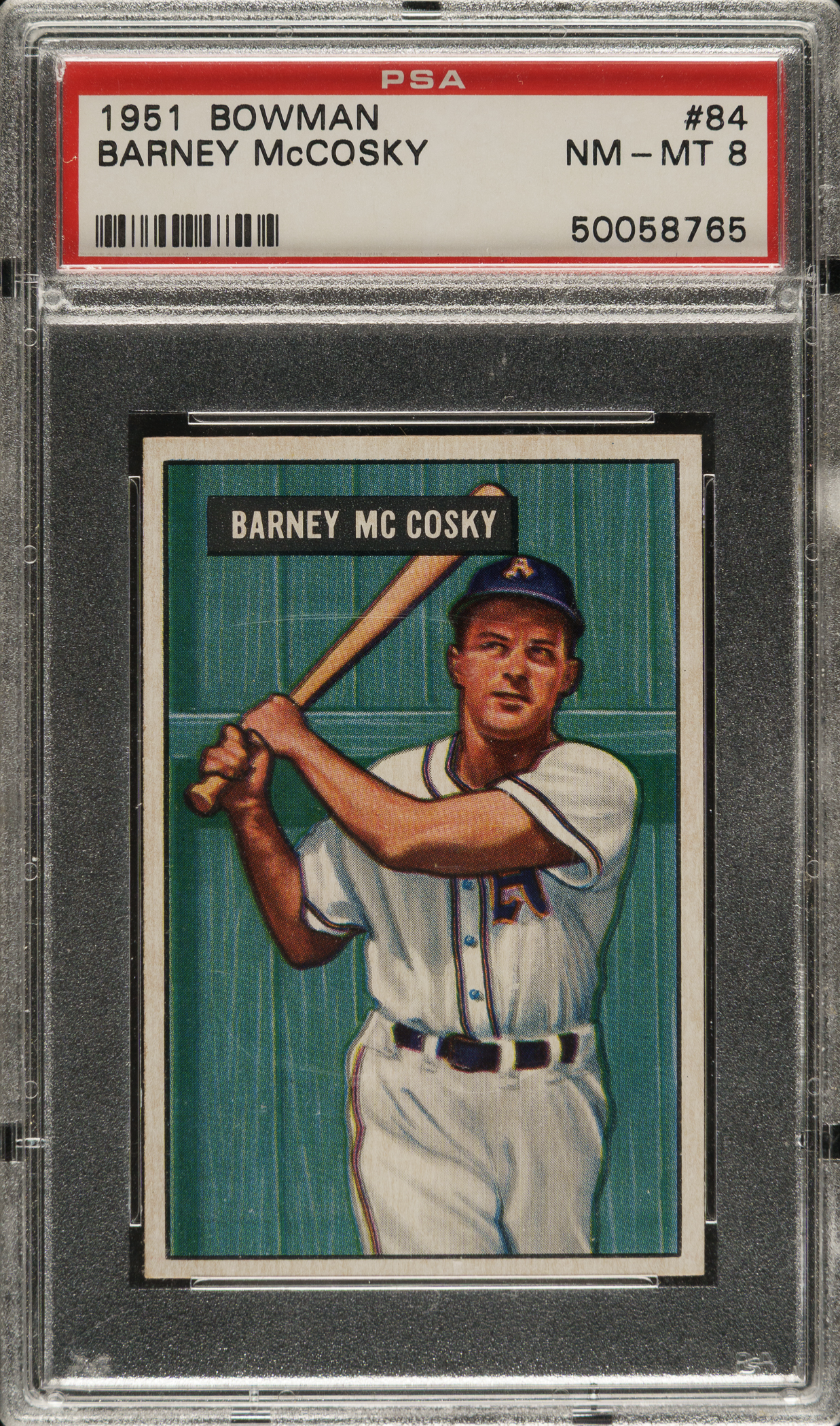 Lot # 2494: 1951 Bowman #84 Barney McCosky PSA NM-MT 8