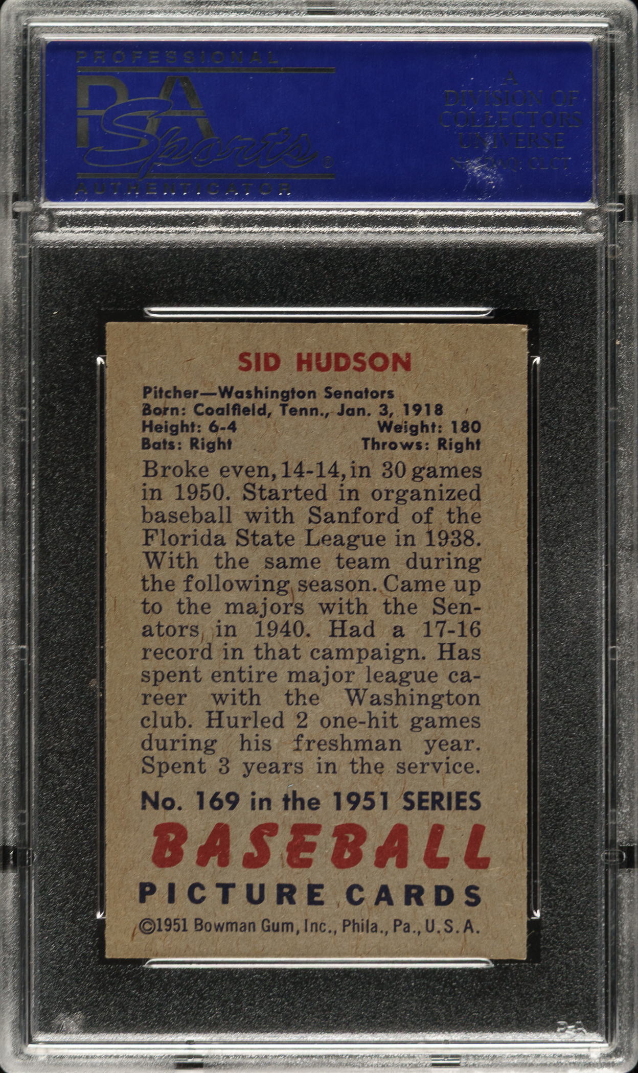 Lot # 2410: 1951 Bowman #169 Sid Hudson PSA NM-MT 8