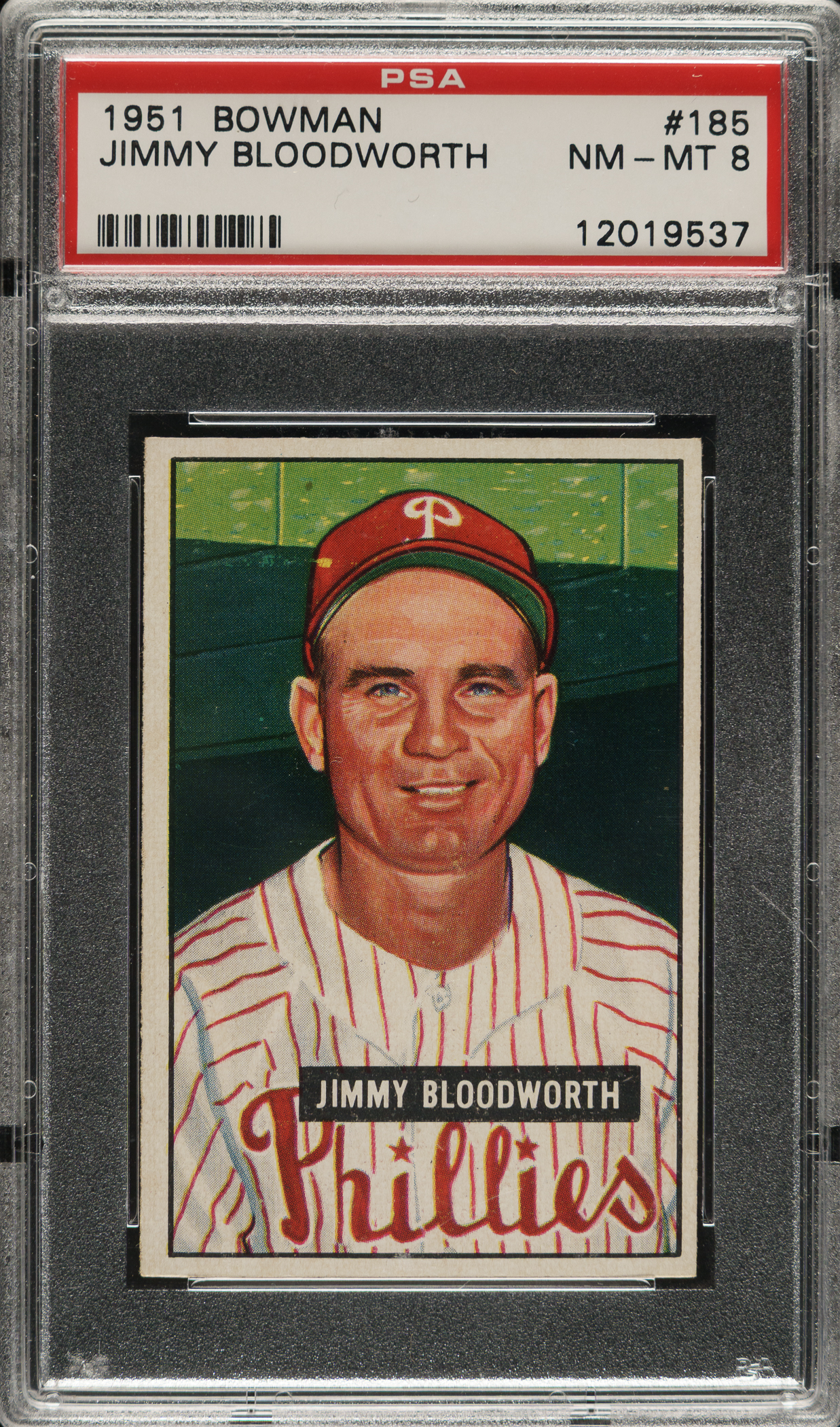 Lot # 2419: 1951 Bowman #185 Jimmy Bloodworth PSA NM-MT 8