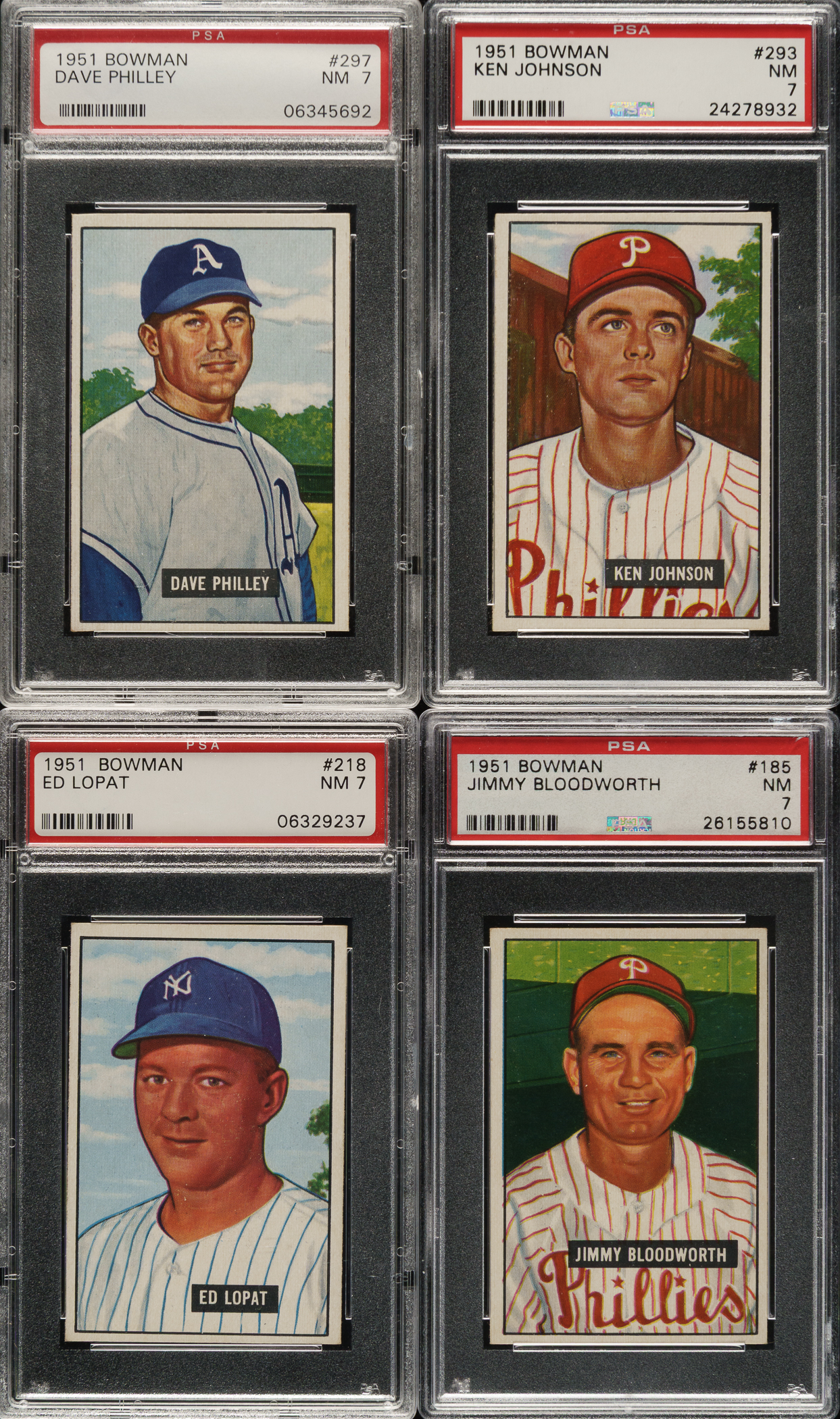 Collection of twenty 1951 Bowman cards, each graded and encapsulated NM 7 by PSA. This collection consists of the following: #43, 71, 95, 125, 132, 157, 158, 163, 168, 169, 170, 185, 193, 197, 206, 218, 223, 245, 293, and 297. Total: 20 cards. The size/weight of this item requires that there will be an additional shipping charge for this lot.