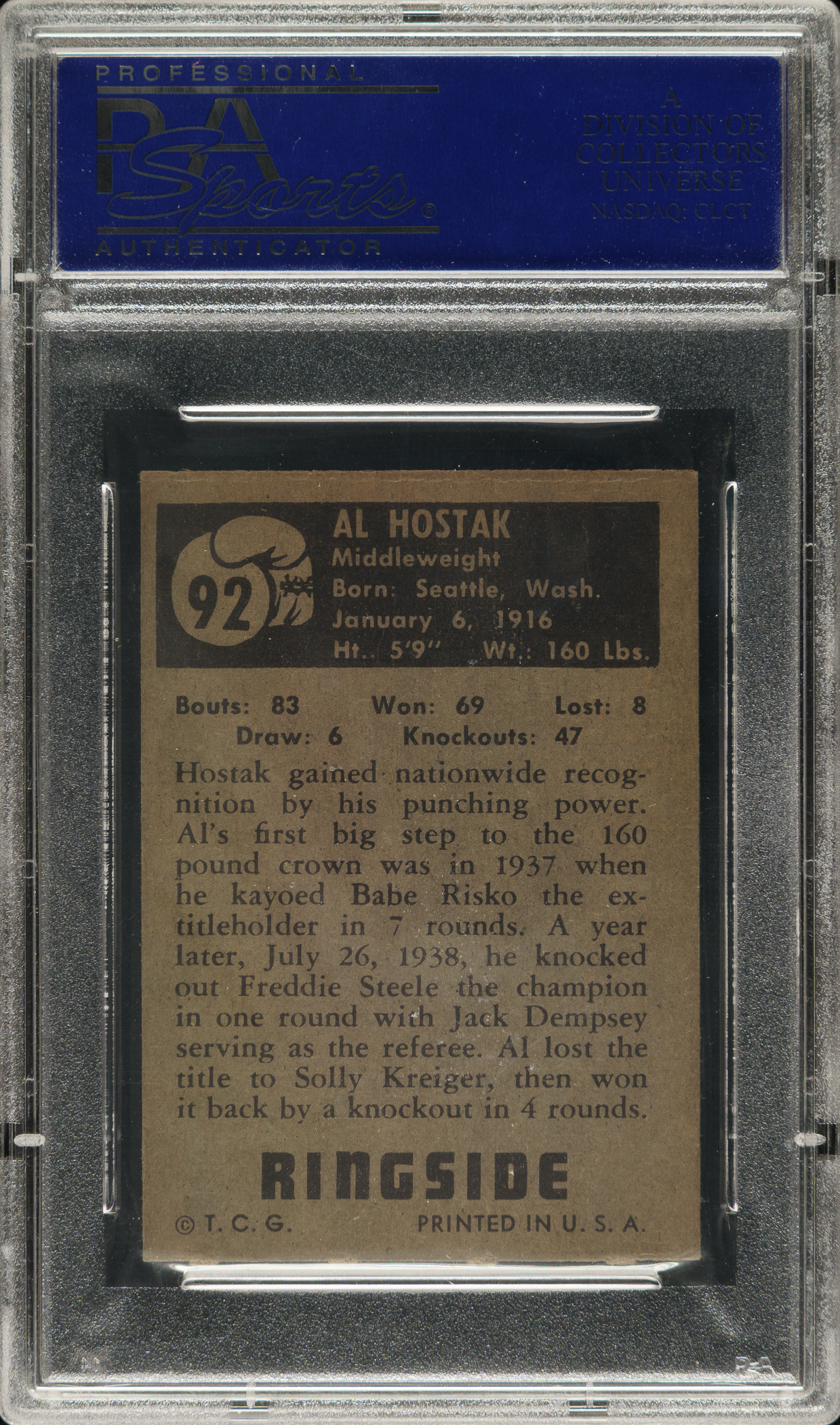 Lot # 4146: 1951 Topps Ringside Boxing #92 Al Hostak PSA NM 7