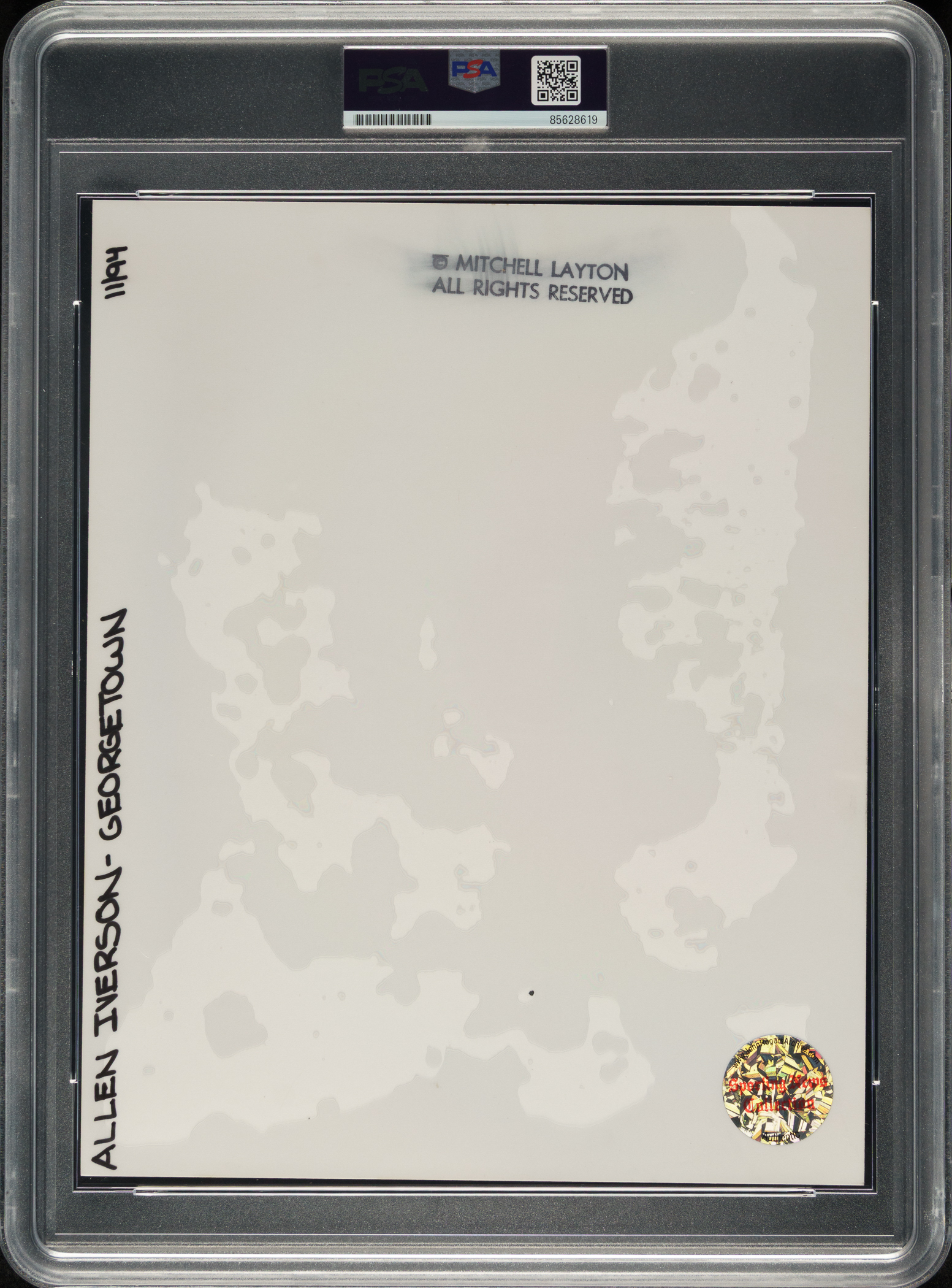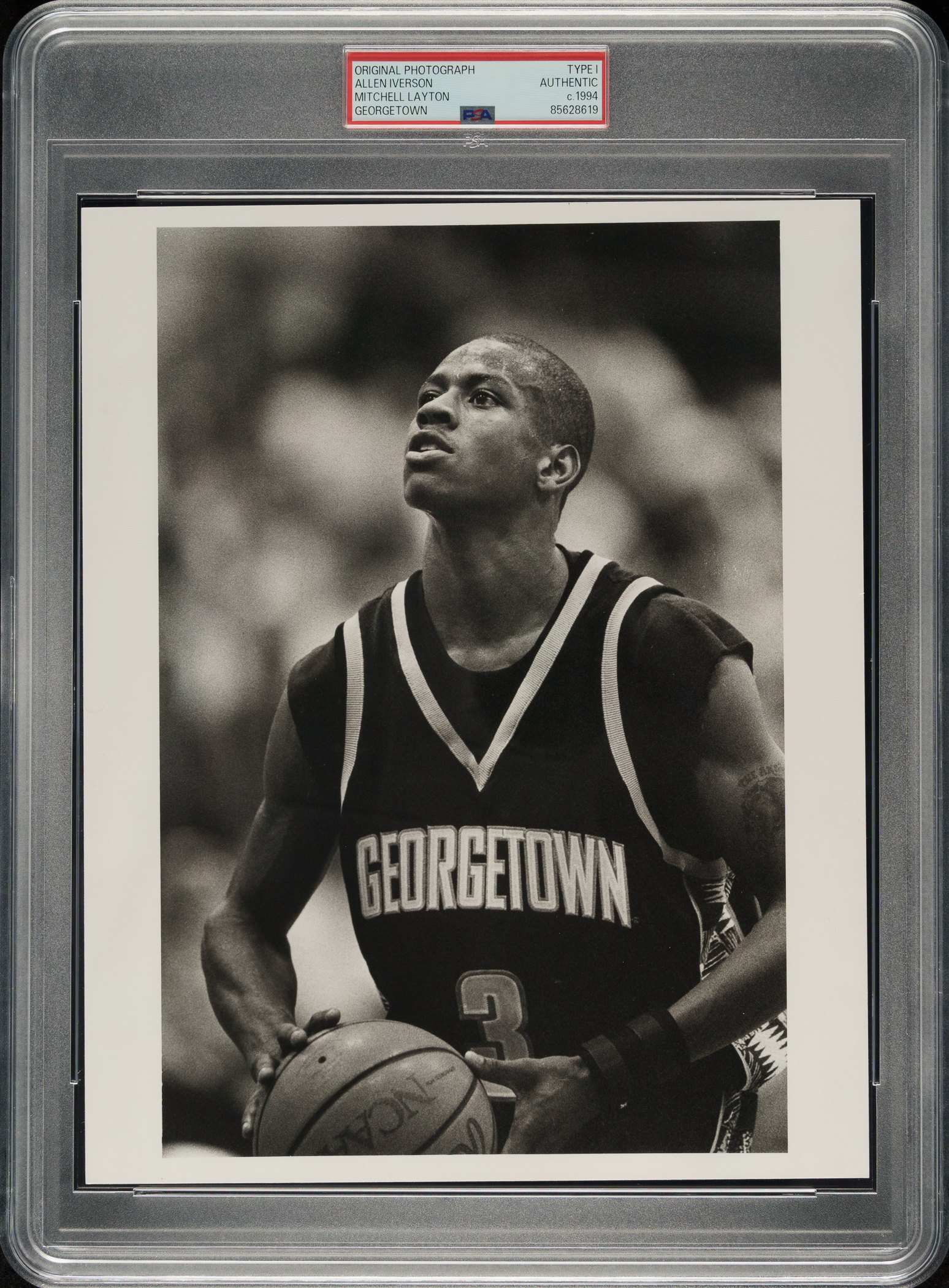 Original photo of Allen Iverson as a member of the Georgetown Hoyas, circa 1992. Encapsulated and certified as an original type I photograph by PSA/DNA. Iverson is captured taking a free throw. The reverse features Iverson's name and school, the time period (11/94), a "Sporting News Collection" hologram label, and a credit sticker for photographer Mitchell Layton. The photo (8 x 10 inches) is in Near Mint condition overall.