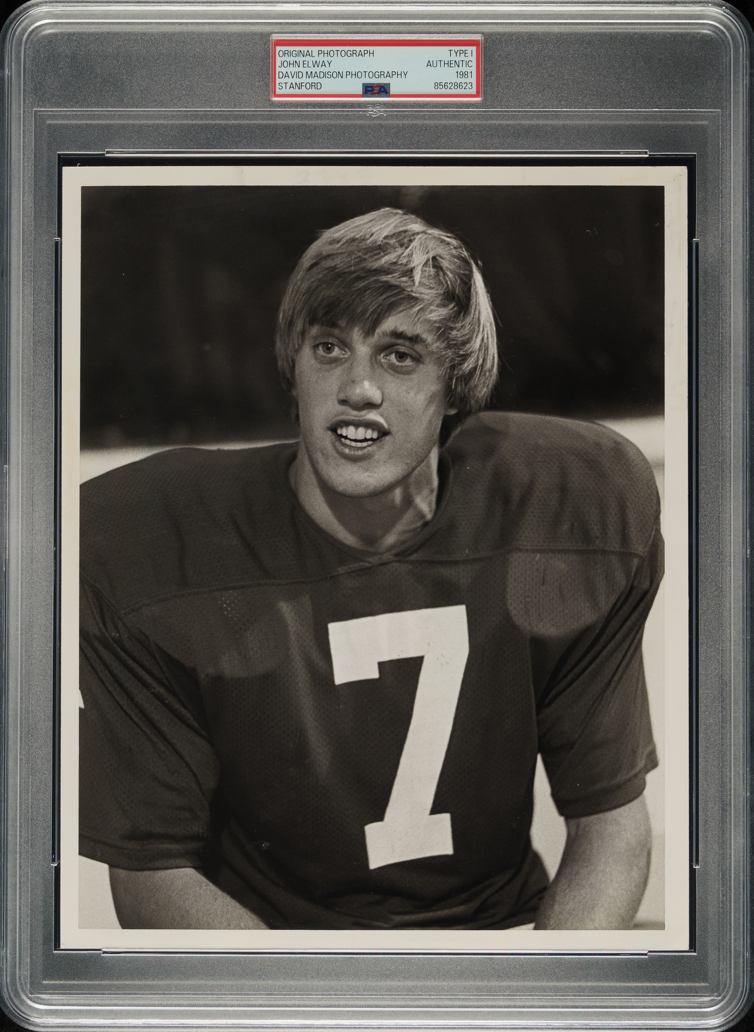 Original photo of John Elway as a member of the Stanford Cardinals in 1981. The reverse bears a "Jan 15 1982" date stamp, a credit stamp for photographer David Madison, and a sticker identifying Elway. The photo (8 x 10 inches) is in Excellent to Near Mint condition overall.