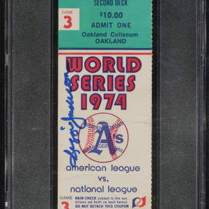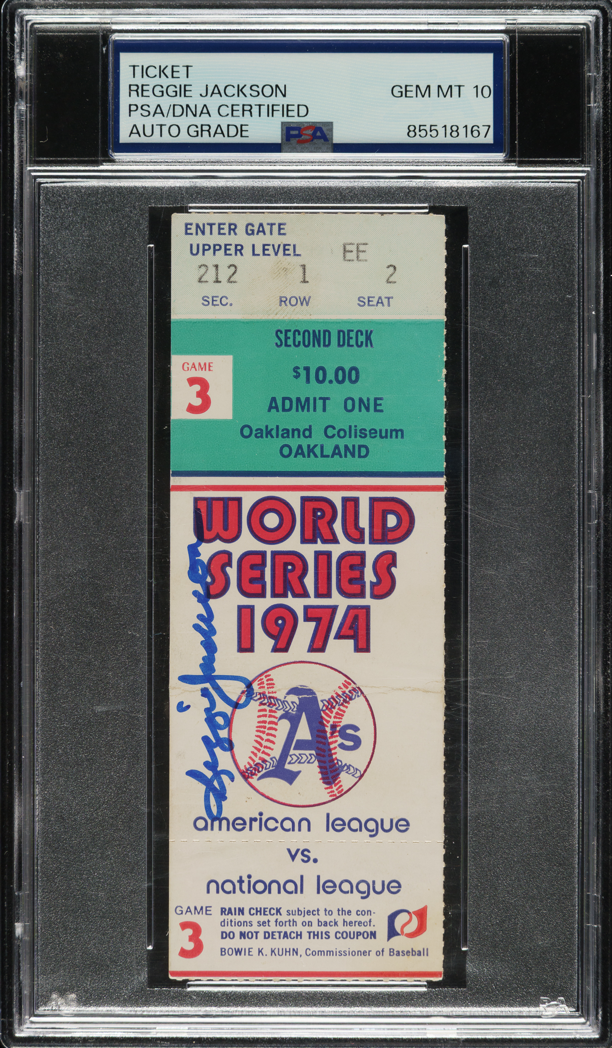 PSA/DNA has encapsulated the ticket, grading the signature GEM MINT 10. Oakland Athletics Hall of Famer Reggie Jackson.