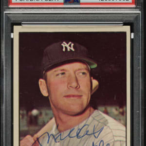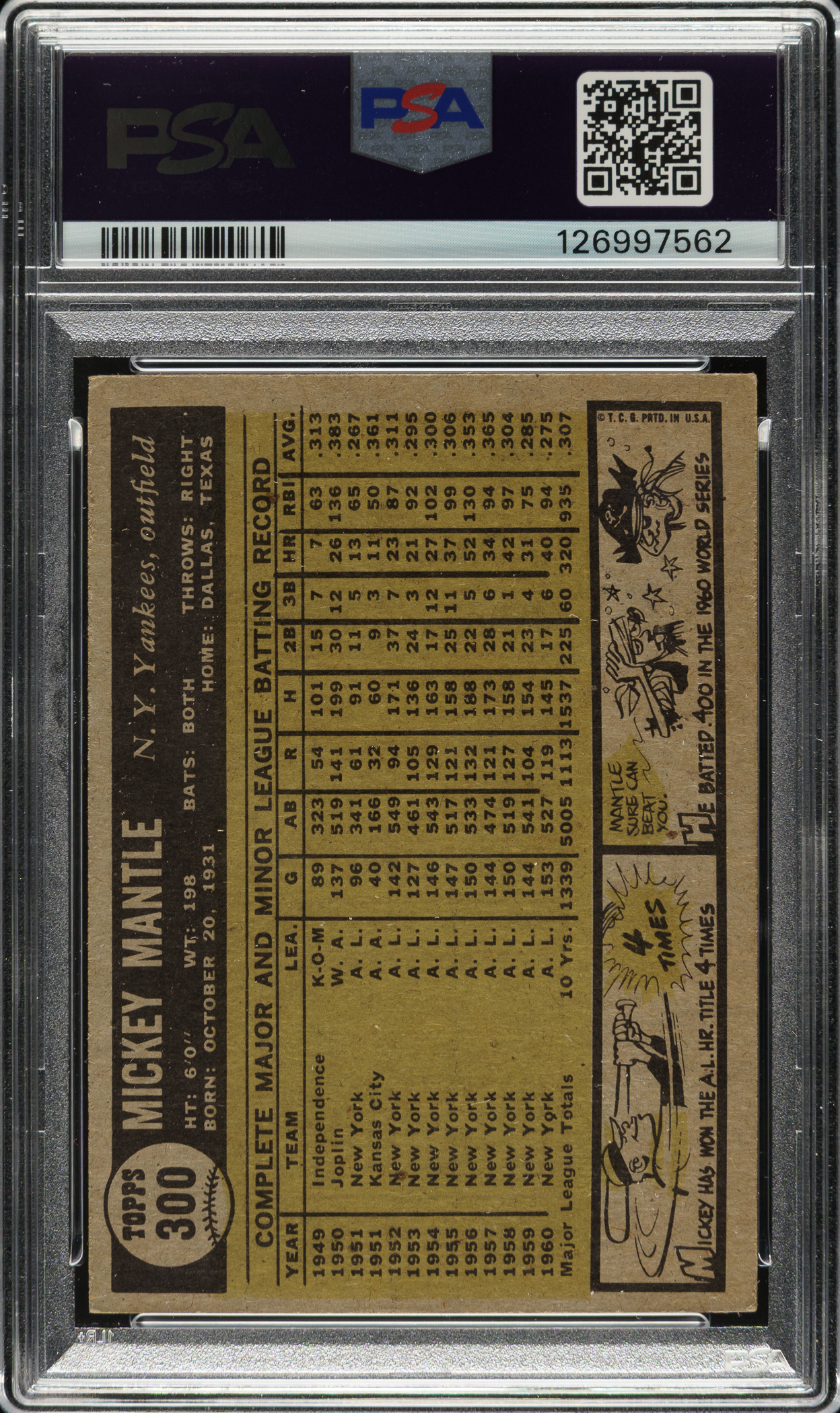 Outstanding signed example of New York Yankees Hall of Famer Mickey Mantle's 1961 Topps card (#300). PSA/DNA has encapsulated the card, grading the signature GEM MINT 10 and the card EX 5. Mantle has boldly signed the card in blue ink along the front. The card displays vibrant colors, superb image quality, and light corner wear. This is just the seventh signed example of this particular card we have ever offered. An attractive Mantle signed card dating from the historic 1961 season!