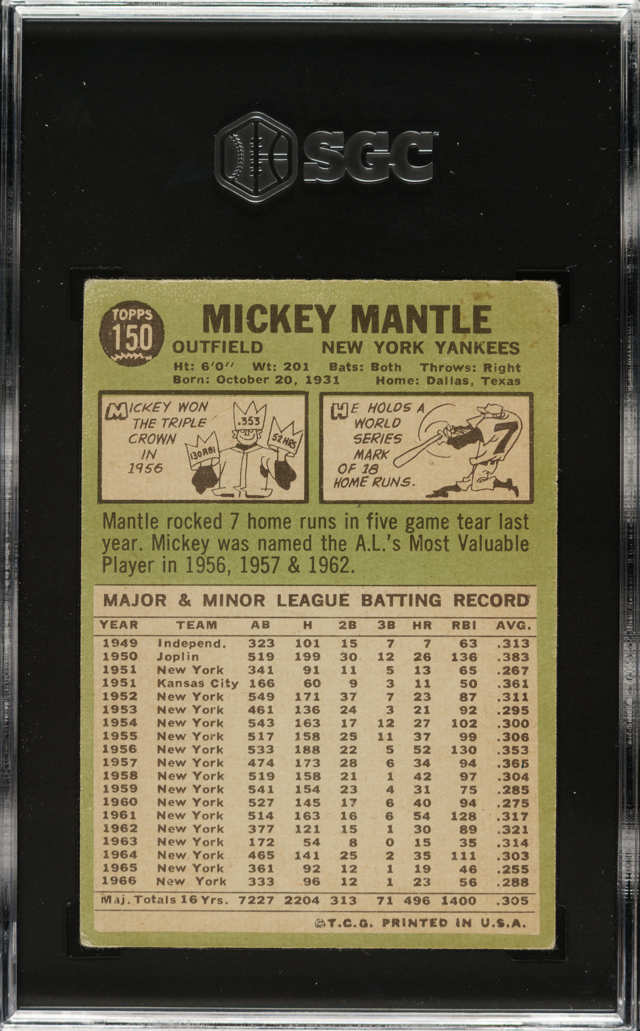 Lot # 3077: 1967 Topps #150 Mickey Mantle SGC VG 3