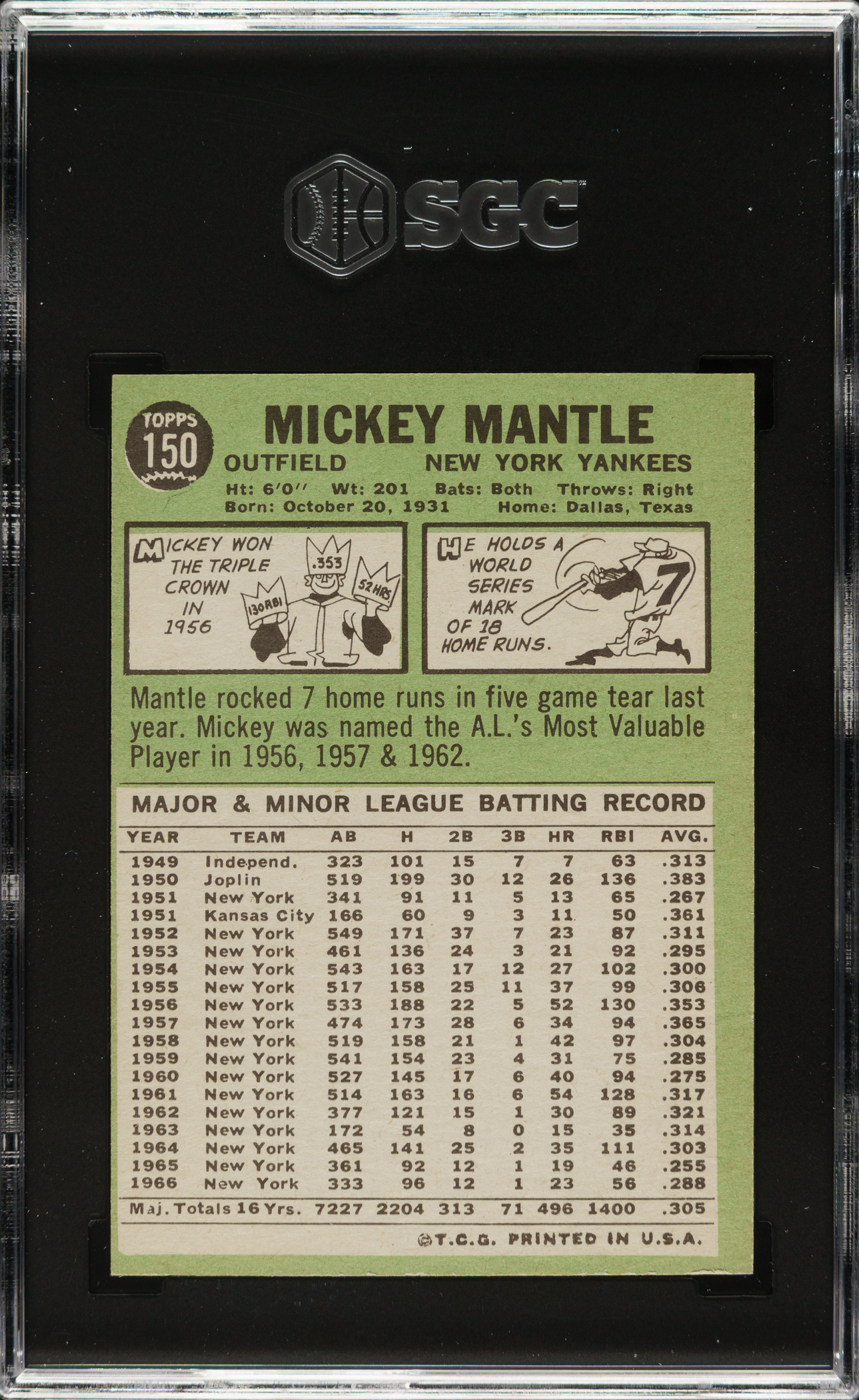 Lot # 3073: 1967 Topps #150 Mickey Mantle SGC EX 5