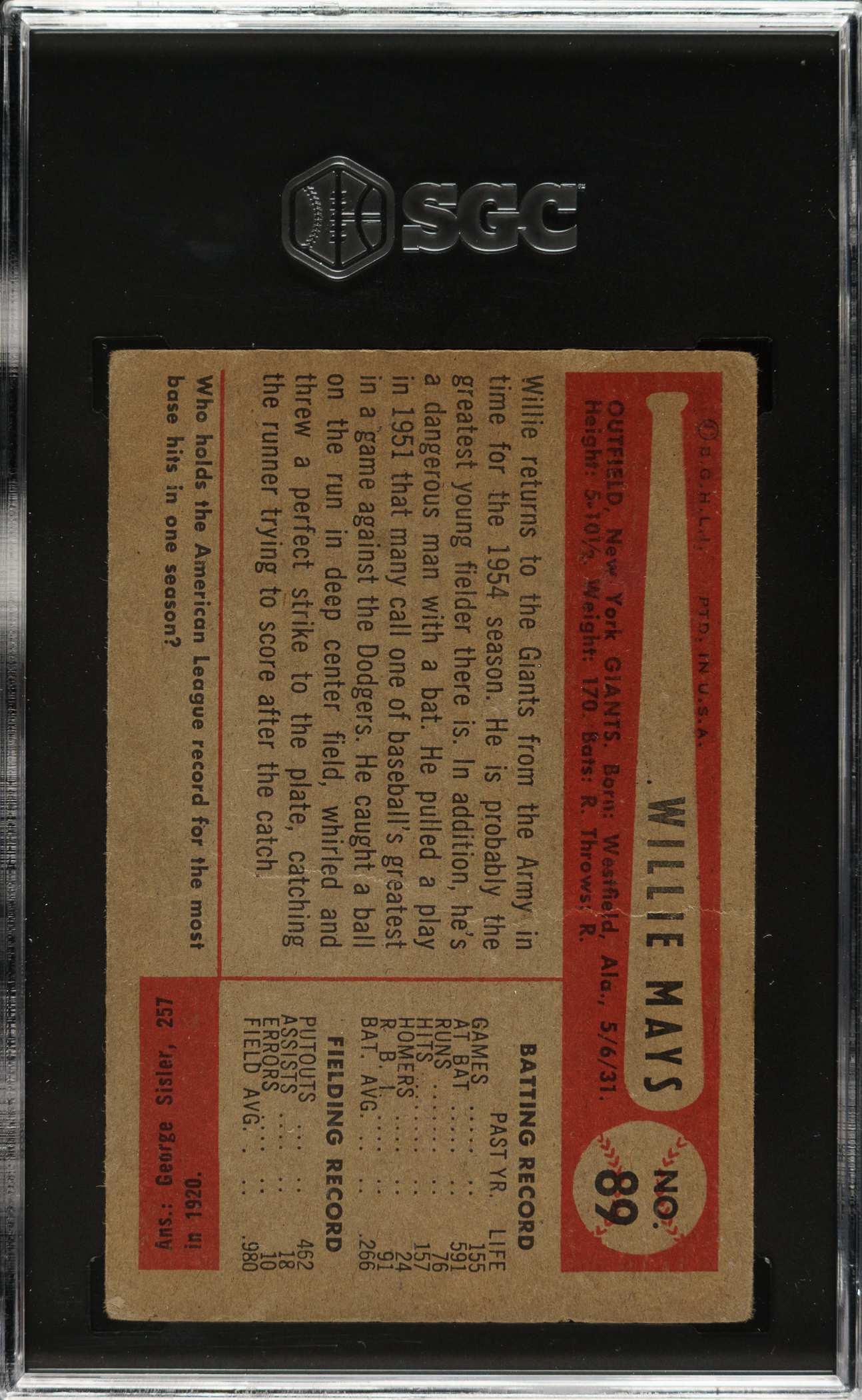 Lot # 2594: 1954 Bowman #89 Willie Mays SGC FAIR 1.5