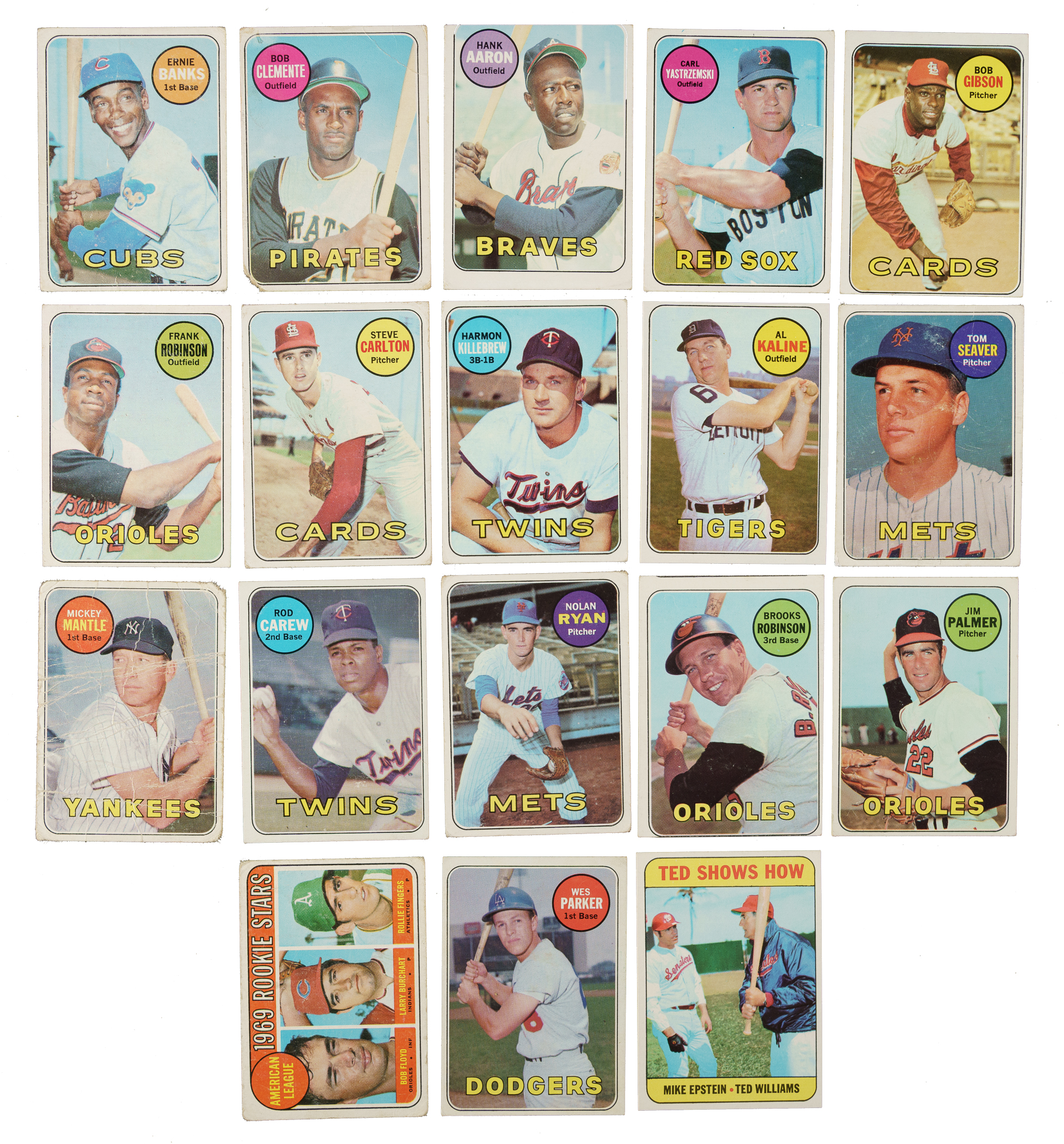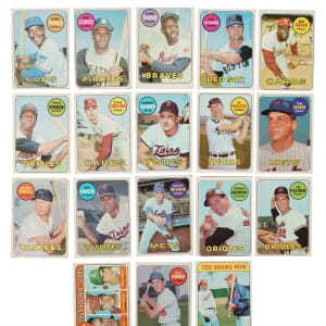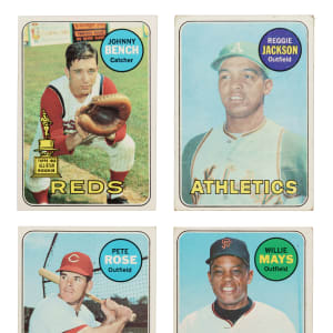 Presented is a complete set of one of the great classics of the 1960s! The 1969 Topps set is highlighted by the rookie cards of Oakland A's Hall of Famers Reggie Jackson and Rollie Fingers, plus the last card of Mickey Mantle. This final card of "The Mick," who retired March 1, 1969, contains his complete statistical record on the reverse. Condition is 14% Ex to Ex-Mt (including eight better), 63% Vg to Vg-Ex (approximately two-thirds Vg), and 23% lesser. Keys: #20 Banks (Fr), 50 Clemente (Pr, with corner missing), 95 Bench (Vg), 100 Aaron (0/100 T/B, otherwise Vg), 120 Rose (Vg-Ex+), 130 Yastrzemski (Vg), 190 Mays (Gd+), 200 Gibson (pen on reverse, otherwise Vg), 250 F. Robinson (Fr), 255 Carlton (Gd), 260 Jackson RC (Fr), 375 Killebrew (Vg), 410 Kaline (25/75 T/B, otherwise Nr/Mt-Mt+), 480 Seaver (color added, otherwise Fr), 493a Parker/white letters (Vg), 500 Mantle (Pr), 510 Carew (Vg-Ex), 533 Ryan (Gd), 539 Ted Show How (Nr/Mt-Mt), 550 B. Robinson (100/0 T/B, otherwise Vg-Ex), 573 Palmer (Vg), and 597 Fingers RC (Fr). This is an attractive mixed-grade complete set of one of the great 1960s Topps issues, loaded with Hall of Famers. Total: 664 cards.