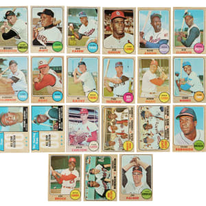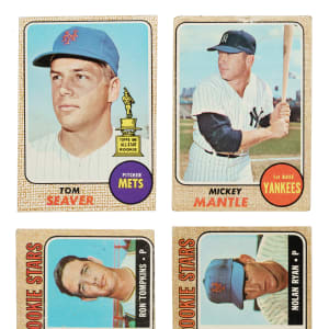 Presented is a complete set of 1968 Topps, highlighted by the rookie cards of Hall of Famers Nolan Ryan and Johnny Bench. The 1968 Topps set also includes the extremely popular “combo” cards featuring more than one player with #480 Managers Dream (with Roberto Clemente), #490 Superstars (Harmon Killebrew, Mickey Mantle, and Willie Mays), and #530 Bird Belters (Frank and Brooks Robinson). Condition is 6% Ex or slightly better, 69% Vg to Vg-Ex (approximately two-thirds Vg), and 25% lesser (including a couple with a slight trim). Keys: #20 B. Robinson (Vg+), 45 Seaver (Vg), 50 Mays (Gd), 80 Carew (Vg), 100 Gibson (Fr), 110 Aaron (100/0 T/B, otherwise Vg-Ex+), 150 Clemente (Vg+), 177 Ryan RC (trimmed and color added, otherwise Fr), 220 Killebrew (Vg), 230 Rose (Vg), 240 Kaline (pen on reverse, otherwise Fr), 247 Bench RC (Pr), 250 Yastrzemski (Gd), 280 Mantle (Pr), 330 Maris (Vg), 355 Banks (Gd+), 370 Aaron AS (Vg-Ex), 374 Clemente AS (Vg), 408 Carlton (Vg-Ex), 480 Manager's Dream (Vg-Ex+), 490 Superstars (Ex due to centering), 500 F. Robinson (Ex+), 520 Brock (small pen mark on reverse, otherwise Gd), 530 Bird Belters (Vg-Ex), and 575 Palmer (Pr). This is a very presentable medium- to lower-grade complete set of one of the great 1960s Topps issues, loaded with Hall of Famers. Total: 598 cards.