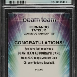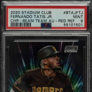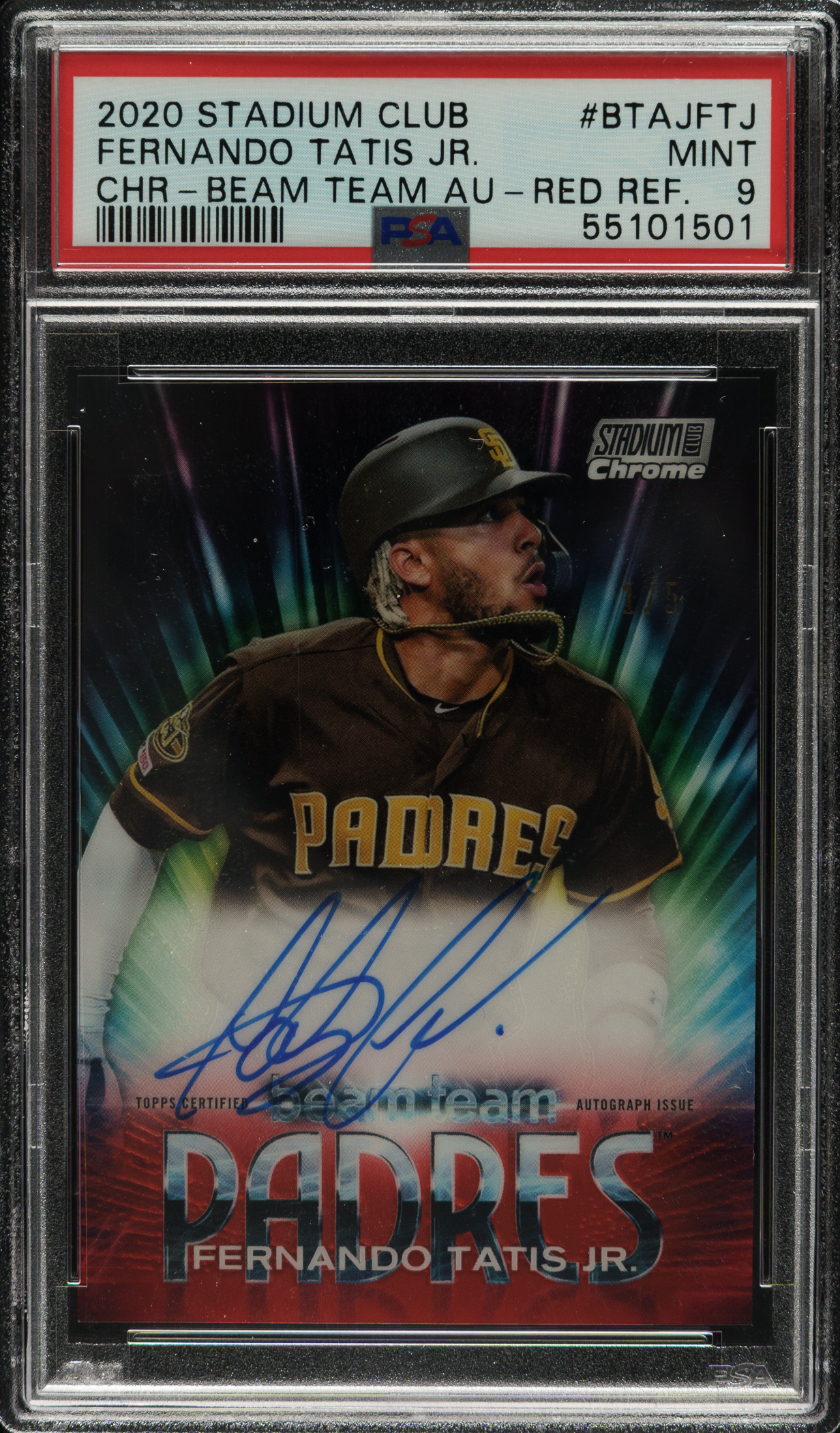 Graded MINT 9 by PSA. 2020 Topps Stadium Club Chrome Beam Team Autographs Red Refactor featuring a blue fine-point marker signature of San Diego Padres superstar Fernando Tatis Jr. on the front. Numbered 1/5 on the front. This is an extremely high-grade and desirable signed card of one of the top young players in the game.