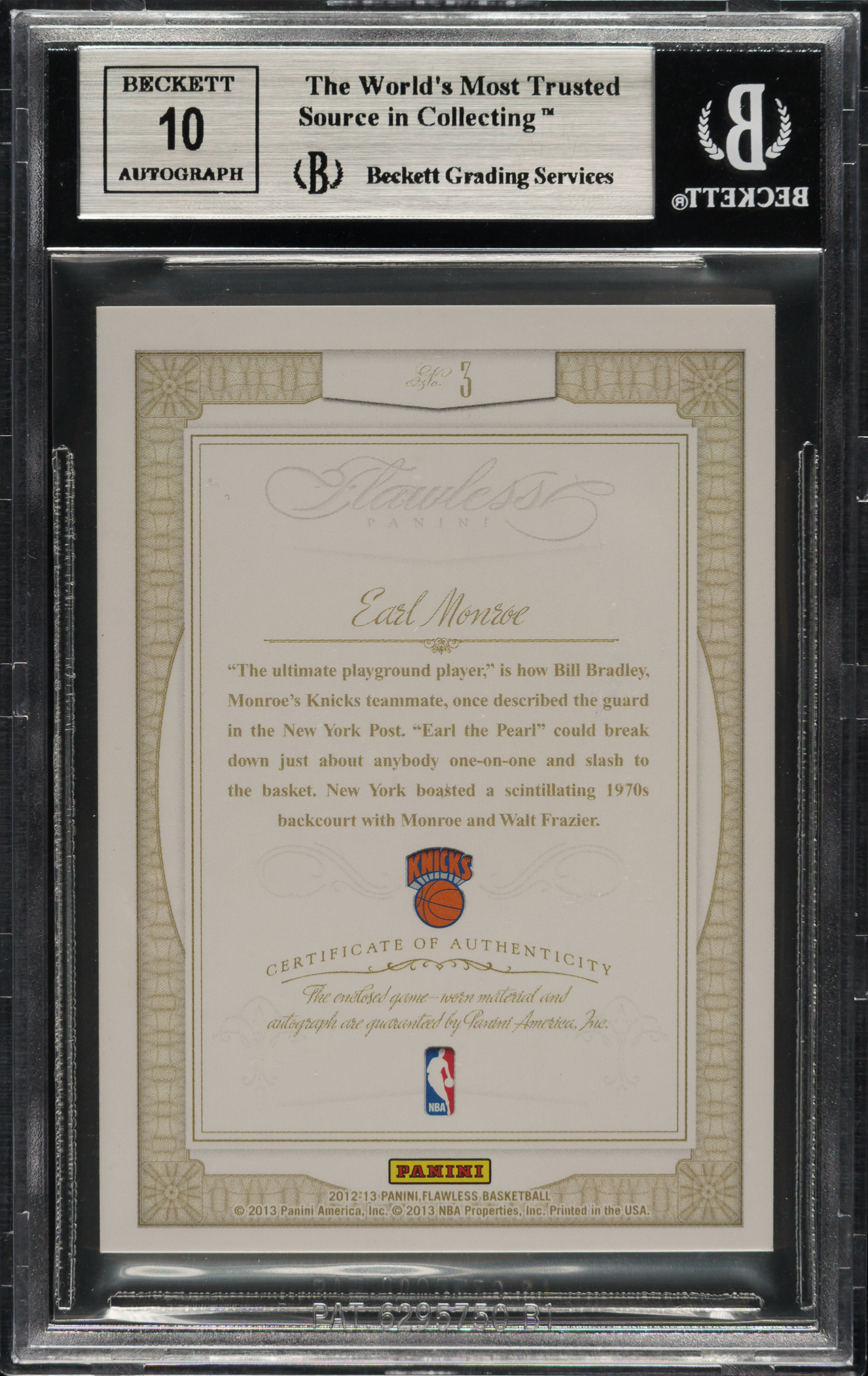 Graded MINT 9 with GEM 10 signature by BGS. Tremendous example of New York Knicks Hall of Famer Earl Monroe from the 2012-2013 Panini Flawless Greats Patches Autographs Basketball series. Signed by Monroe in blue fine-point marker and numbered 1/1 on the front. The game-used memorabilia featured on the front is guaranteed by Panini. Subgrades are 9.5 for centering and surface, 9 for edges, and 8.5 for corners.