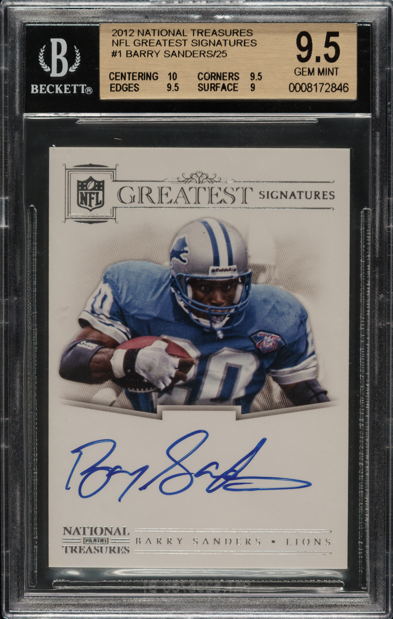 Graded GEM MINT 9.5 with GEM 10 signature by BGS. Stunning example of Detroit Lions Hall of Famer Barry Sanders from the 2012 Panini National Treasures NFL Greatest Signatures Football set. Signed by Sanders in blue fine-point marker on the front and numbered 15/25 on the reverse. This series features on-card autographs from several of NFL's all-time greats. Subgrades are 10 for centering, 9.5 for corners and edges, and 9 for surface.