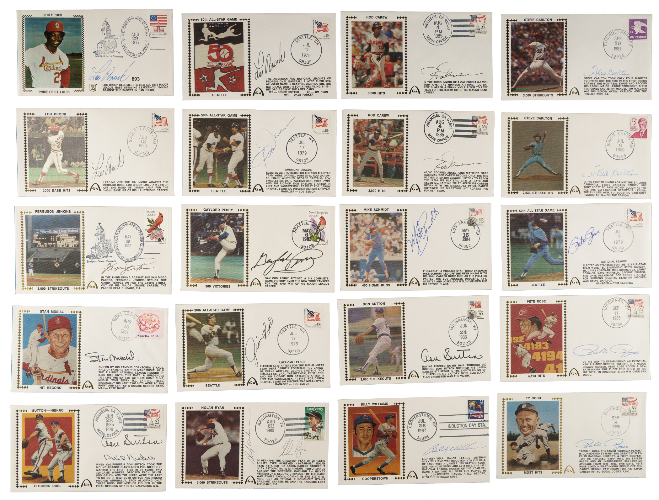 Collection of 46 signed first-day covers featuring the signatures of 31 Hall of Famers. Dates range from 1977 to 1989, with all but one ("Z") issued by Gateway. The signatures, scripted in a variety of inks on the front of each first-day cover. Near Mint condition overall. The number of signed first-day covers for each player (if more than one) is noted in parentheses. Hall of Famers (31): Brock (3), Carew (3), Carlton (3), DiMaggio, Henderson/Brock, Hubbell, Hunter, Jackson, Jenkins, Kaline, Mays, McCovey, Musial, Niekro/Sutton, Perry, Rice, Ryan (3), Ryan/Henderson, Schmidt (2), Seaver, Sutton, and B. Williams. Non-Hall of Famers (15): Aikens (2), Barker, Clemens, Evans, Foster, Gooden, T. McGraw, Quisenberry, Rose (5), and Trillo. Total: 46 signed first-day covers. Auction LOA from James Spence/JSA.
