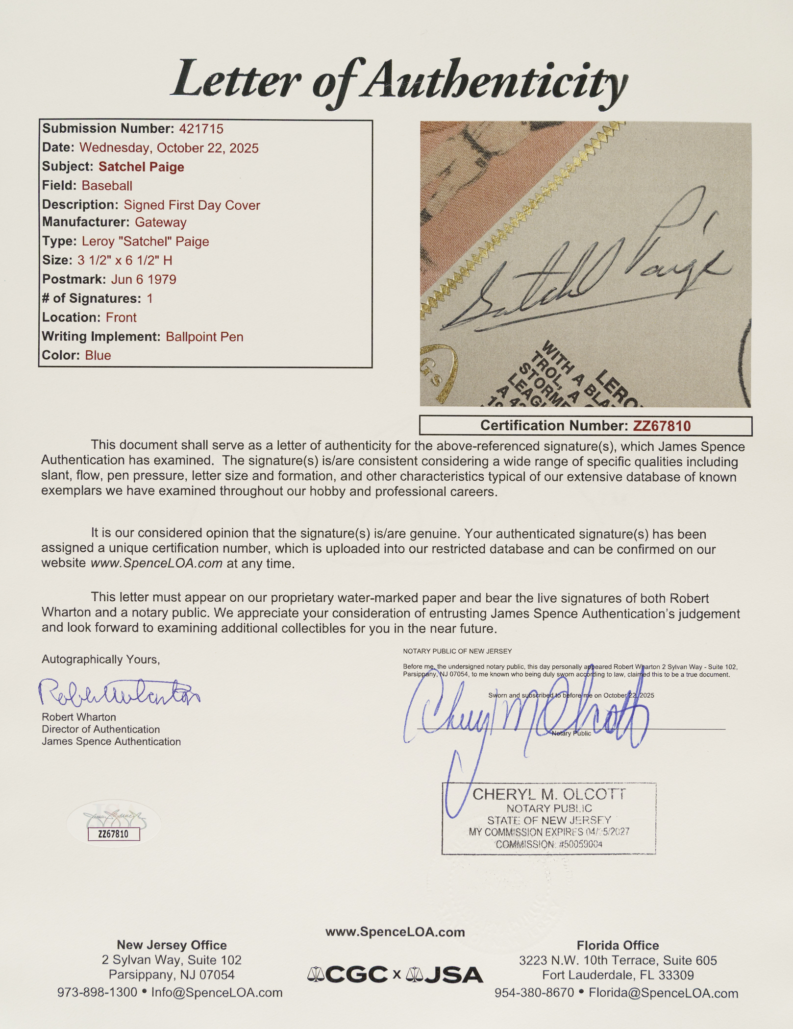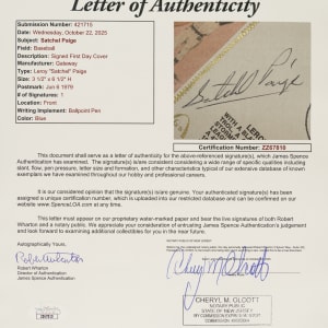 St. Louis Browns Hall of Famer Satchel Paige signed First-Day Cover. Full LOA from James Spence/JSA.