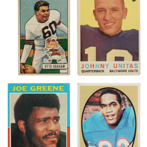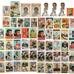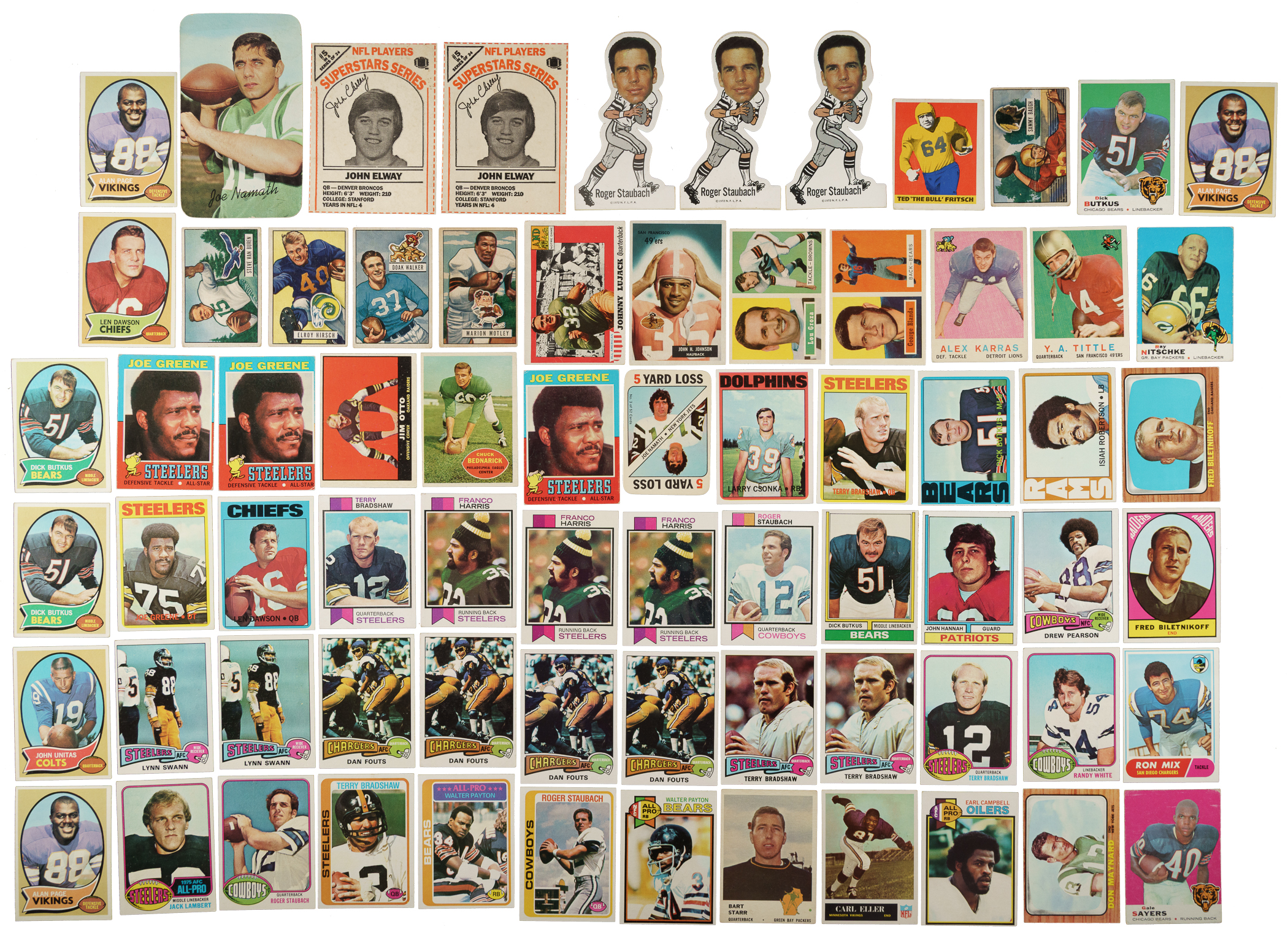 Impressive collection of 142 Topps, Bowman, and Philadelphia (including a few Fleer and Leaf) football cards dating from 1951 to 1986. The grouping is highlighted by 103 Hall of Famers, including Sammy Baugh, Johnny Unitas, Joe Namath, and rookie cards of Deacon Jones, O.J. Simpson, Ken Stabler (3), and Joe Greene (4). This collection consists of the following: 1) 1948 Leaf (1 card): #35 (Vg). 2) 1951 Bowman (11 cards): #2 Graham (Gd), 10 Van Buren (Vg+), 21 Weinmeister RC (Gd), 25 Walker (Vg), 34 Baugh (Pr), 73 Lavelli (Vg), 76 Hirsch (Gd), 90 Canadeo (pencil on reverse, otherwise Vg+), 91 Tunnell RC (rough cut, otherwise Gd+), 109 Motley (Vg), and 140 Nomellini (pencil on reverse, otherwise Vg). 3) 1951 Topps Magic (1 card): #75 Carey (scratched-off reverse, otherwise Vg). 4) 1953 Bowman (28 cards): Ranging from Vg to Ex overall (averaging Vg-Ex). Includes: #5, 7, 8, 9 Motley (95/5 T/B, otherwise Vg-Ex), 12, two 15 Lavelli (Ex and Vg-Ex+), two 16, 19, 27, 28, 39, 40, 41, 42, 44, 45, 46, 47, 49, 51, 54, 74, 79, 80, 83, 87, 88 Nomellini (85/15 T/B, otherwise Ex), and 92. 5) 1955 Topps All-American (3 cards): #10 Dudley (Vg), 52 Lujack (Vg), and 59 Blanchard (Vg+). 6) 1955 Bowman (1 card): #42 Johnson RC (Vg-Ex). 7) 1957 Topps (4 cards): #28 Groza (Nr/Mt), 31 Blanda (95/5 L/R, otherwise Ex-Mt), 59 Rote (Ex), and 152 (Vg). 8) 1958 Topps (2 cards): #32 Dillon (Vg-Ex) and 42 Tunnell (Ex). 9) 1959 Topps (3 cards): #1 Unitas (Gd), 103 Karras RC (Vg), and 130 Tittle (Nr/Mt). 10) 1960 Topps (1 card): #87 Bednarik (Ex). 11) 1961 Topps (1 card): #182 Otto RC (Vg+). 12) 1961 Fleer (2 cards): #59 Brodie RC (Vg-Ex) and 88 Starr (Vg+). 13) 1963 Topps (4 cards): #44 Jones RC (ink mark on reverse, otherwise Vg), 110 Jurgensen (Ex), 129 Stautner (Ex+), and 158 Snead (Ex). 14) 1964 Philadelphia (1 card): #48 Lilly (Vg-Ex+). 15) 1965 Philadelphia (1 card): #105 Eller RC (Ex+). 16) 1966 Topps (3 cards): #95 Maynard (Ex), 104 Biletnikoff (Vg-Ex+), and 128 Mix (Ex+). 17) 1967 Topps (1 card): #106 Biletnikoff (Ex). 18) 1967 Philadelphia (1 card): #37 Browns Team (measures a bit small, otherwise Nr/Mt-Mt). 19) 1968 Topps (1 card): #89 Mix (Ex). 20) 1969 Topps (4 cards): #51 Sayers (Vg), 55 Nitschke (Vg), 123 Karras (Ex+), and 139 Butkus (Vg). 21) 1970 Topps (9 cards): #1 Dawson (Vg-Ex+), three 59 Page RC (Ex and two Vg-Ex), 90 Simpson RC (Vg), 180 Unitas (Vg-Ex), 189 Hayes (Nr/Mt), and two 190 Butkus (Vg+ and Vg). 22) 1970 Topps Super (1 card): #33 Namath (Pr-Fr due to spot of back damage). 23) 1970 Topps Super Glossy (1 card): #6 Renfro (tilt to picture, otherwise Ex-Mt). 24) 1971 Topps (4 cards): Four #245 Greene RC (three Vg and Gd+). 25) 1971 Topps Game (1 card): #3 Namath (Vg-Ex). 26) 1972 Topps (13 cards): #140 Csonka (Ex-Mt), 150 Bradshaw (Ex due to centering), 170 Butkus (Ex due to centering), 215 (Nr/Mt+), 230 Greene (Vg+), 239 (Nr/Mt+), 240 Little (Nr/Mt), two 244 Joiner RC (Ex due to centering and Vg-Ex), 245 Dawson (Ex due to centering), 251 Unitas PA (Ex-Mt), 331 Morris RC (Nr/Mt-Mt), and 341 Butkus PA (Ex-Mt). 27) 1972 NFLPA Vinyl Stickers (3 cards): Three Staubach (two Nr/Mt and Ex). 28) 1973 Topps (8 cards): #15 Bradshaw (Ex), three 89 Harris RC (two Ex-Mt and Vg), 475 Staubach (Vg-Ex), and three 487 Stabler RC (Vg-Ex+, Vg, and Gd). 29) 1974 Topps (5 cards): #105 Rashad RC (Nr/Mt), 129 Tarkenton (Ex), 230 Butkus (Nr/Mt), 383 Hannah RC (Vg-Ex), and Steelers team checklist (Vg-Ex+). 30) 1975 Topps (11 cards): #65 Pearson RC (10/90 L/R, otherwise Nr/Mt), two 282 Swann RC (Nr/Mt and Ex+), 300 Harris (Ex+), four 367 Fouts RC (three Ex and Vg+), 380 Stabler (Ex+), and two 461 Bradshaw (both Vg-Ex). 31) 1976 Topps (4 cards): #75 Bradshaw (Ex), 158 White RC (Vg-Ex), 220 Lambert RC (Vg-Ex+), and 395 Staubach (Nr/Mt-Mt). 32) 1978 Topps (3 cards): #65 Bradshaw (Vg-Ex+), 200 Payton (slightly miscut right edge, otherwise Vg-Ex), and 290 Staubach (Nr/Mt+). 33) 1979 Topps (3 cards): #65 Greene (Ex-Mt), 390 Campbell RC (95/5 T/B, otherwise Ex), and 480 Payton (Ex due to centering). 34) 1986 DairyPak NFL Players Superstars Series - Orange Letters (2 cards): Two #5 Elway (Vg+ and Vg). This is truly a collection unto itself, offering an immediate extensive collection of mostly stars and Hall of Fame cards, including numerous rookie examples. Total: 142 cards.