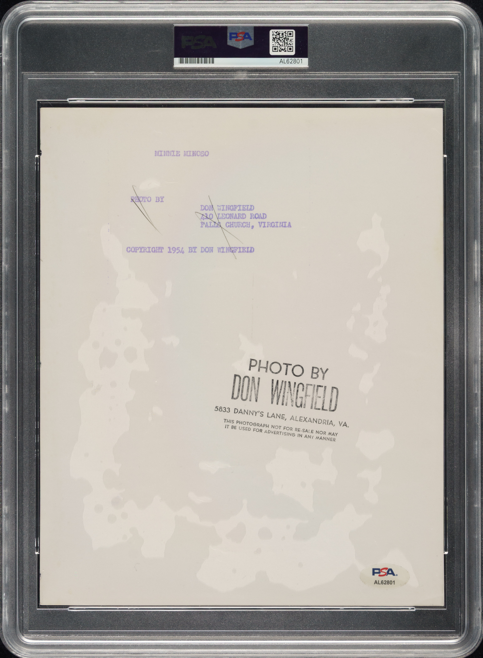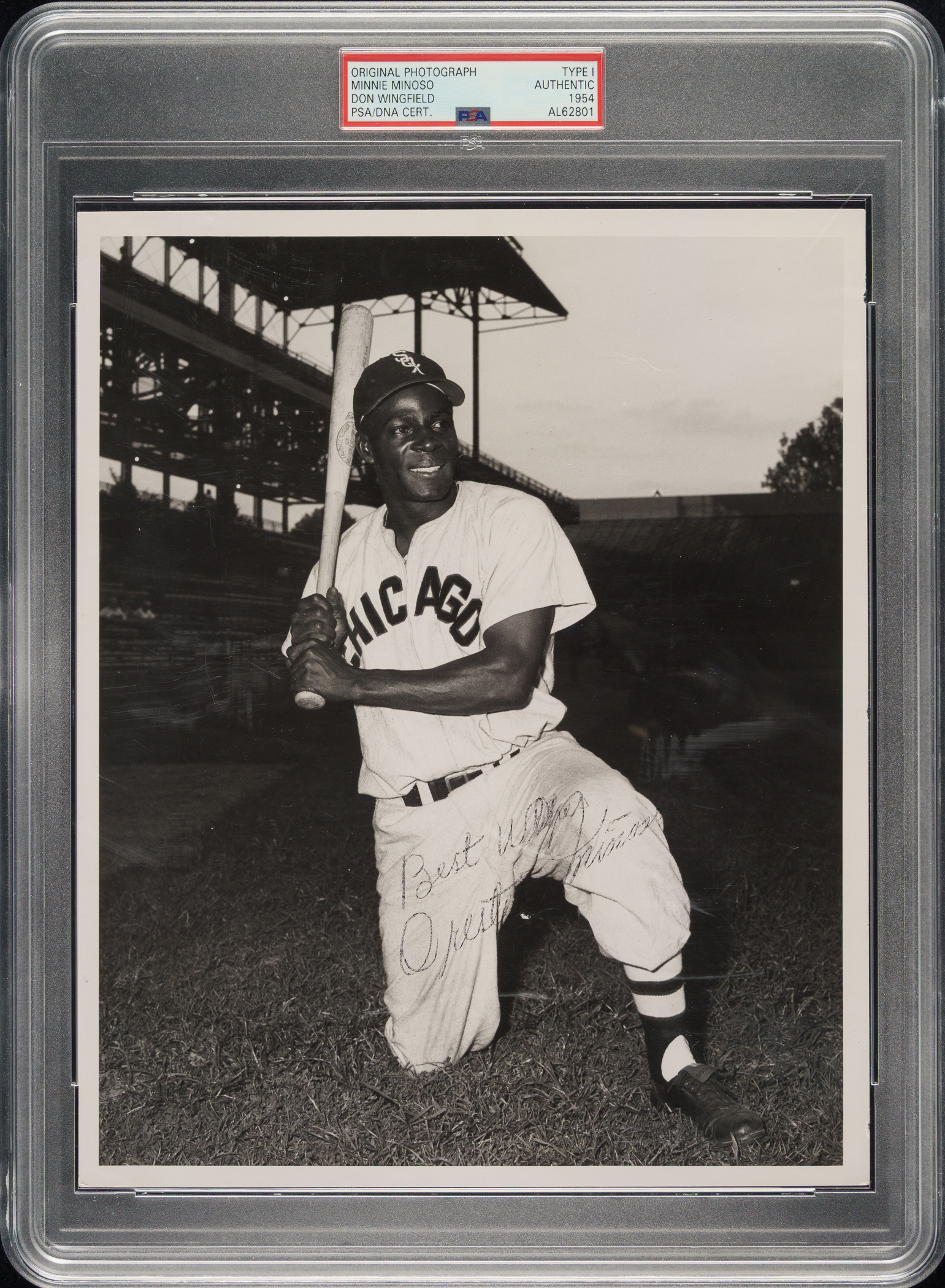 Original photo of Minnie Minoso as a member of the Chicago White Sox, taken by noted photographer Don Wingfield in 1954, signed and inscribed by the Hall of Fame outfielder in black fountain pen. PSA/DNA has encapsulated the photo and certified both the signature as "Authentic" and the photograph as a Type I. Minoso has inscribed the photo "Best Wishes/Minnie Minoso." The photo captures a smiling Minoso on a knee holding a bat. A pair of Don Wingfield credit stamps appear on the reverse. The photo (8 x 10 inches) displays a few creases and a chipped top-right border. Very Good condition overall.