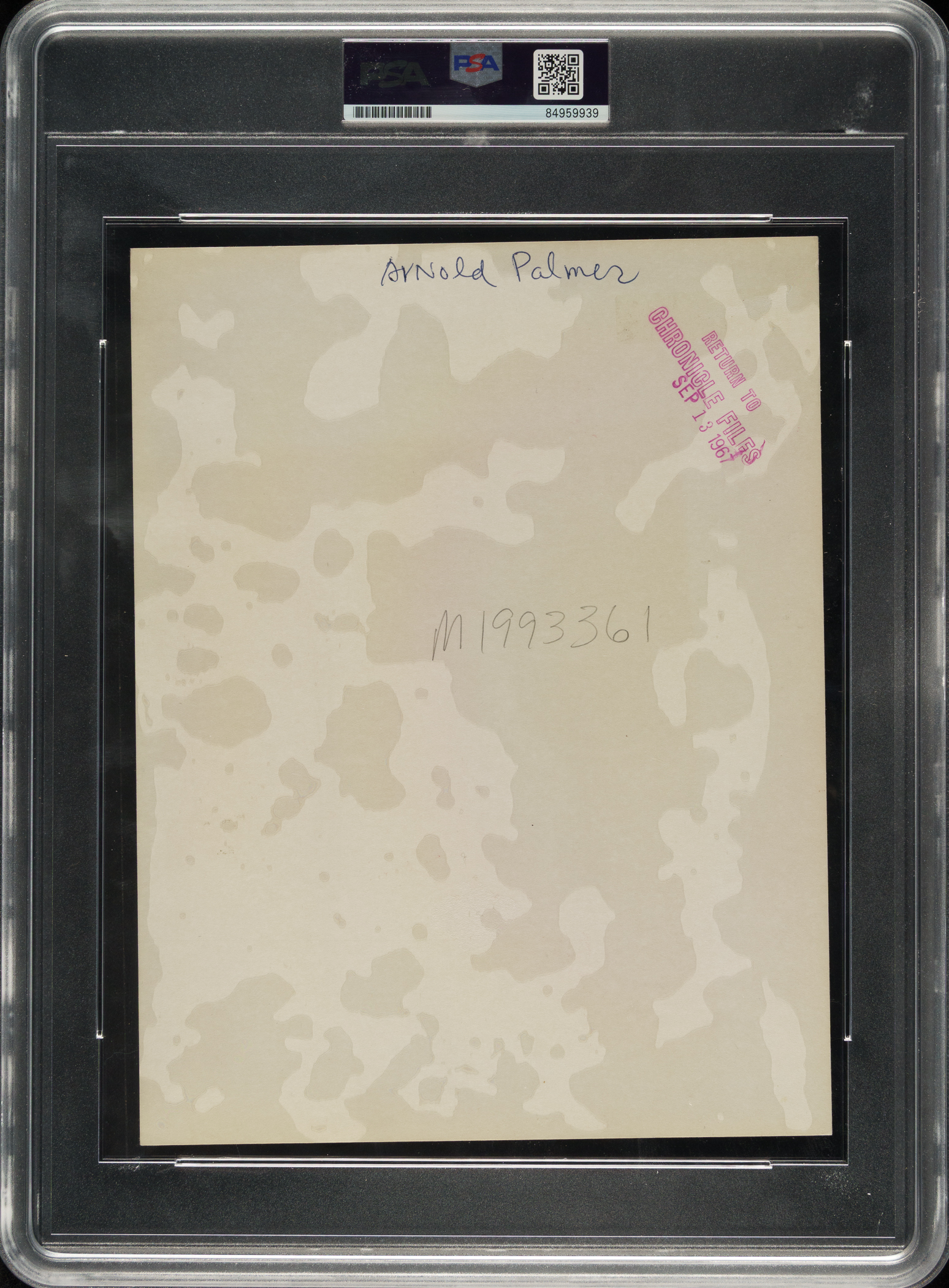 Original photo of legendary golfer Arnold Palmer in 1967. Encapsulated and certified as an original Type I photograph by PSA/DNA. A "Houston Chronicle" filing stamp dated "Sep 13 1967" appears on the reverse, along with Palmer's name and an editorial notation. The photo (7 x 9 inches) is in Excellent condition overall.