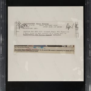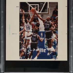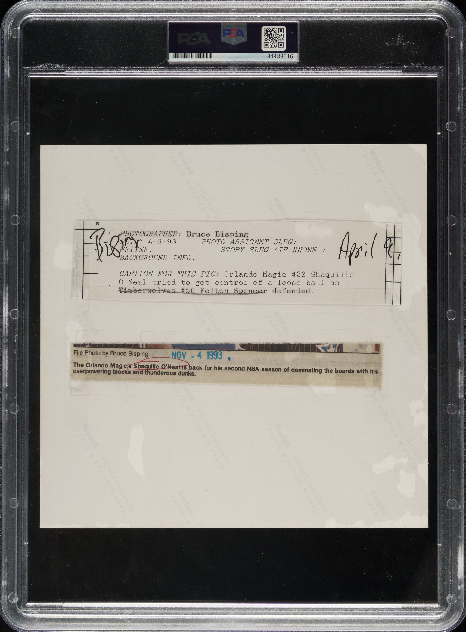 Original photo of Shaquille O'Neal as a member of the Orlando Magic in 1993. Encapsulated and certified as an original Type I photograph by PSA/DNA. O'Neal is captured denying Marlon Maxey's (Minnesota Timberwolves) shot at the rim. The reverse displays a paper news caption and a newspaper clipping with a "Nov 4 1993" date stamp. The photo (8 x 8 inches) features editorial crop marks on the front and is in Excellent condition overall.