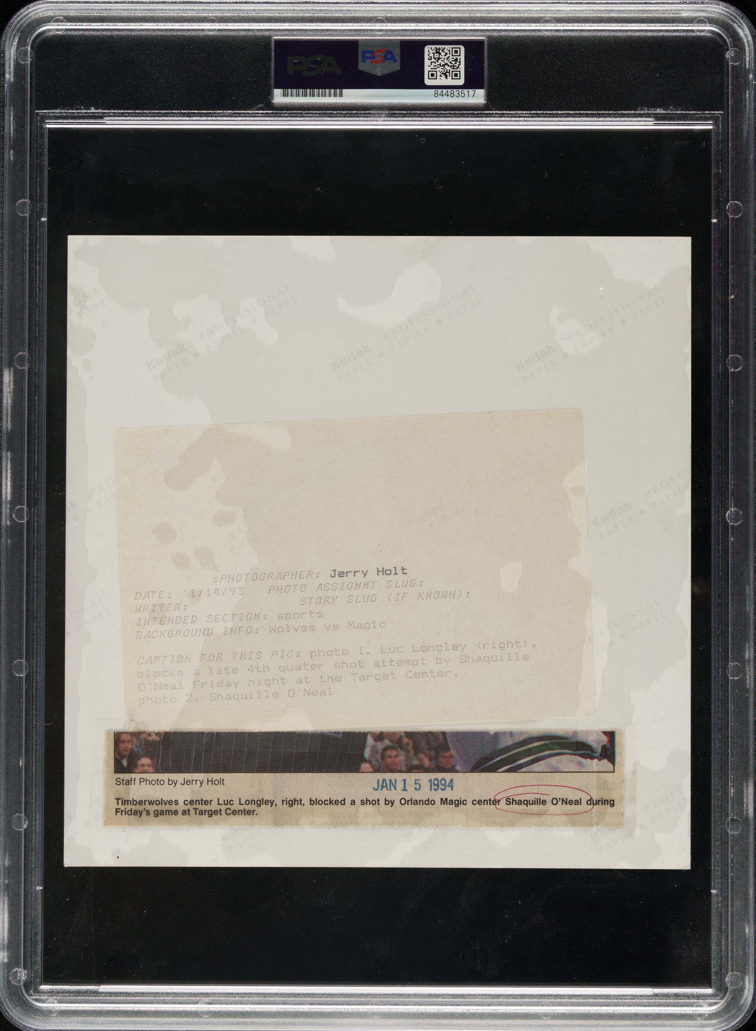 Original photo of Shaquille O'Neal as a member of the Orlando Magic in 1993. Encapsulated and certified as an original Type I photograph by PSA/DNA. O'Neal is captured getting blocked on a dunk attempt by Luc Longley of the Minnesota Timberwolves. The reverse displays a paper news caption and a newspaper clipping with a "Jan 15 1994" date stamp. The photo (8 x 8 inches) features editorial sizing notes on the front and a patch of paper loss in the bottom left. Very Good condition overall.