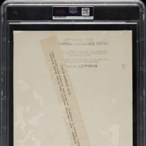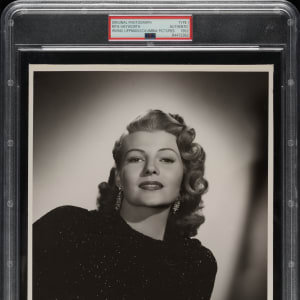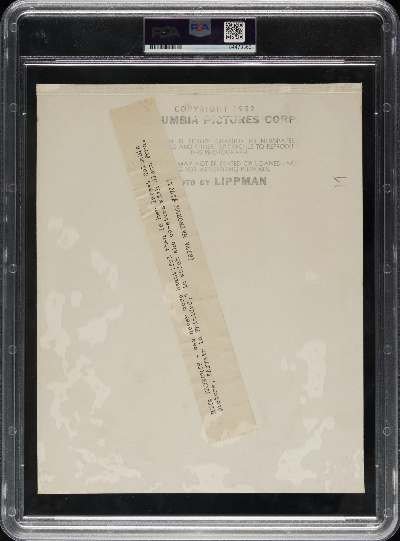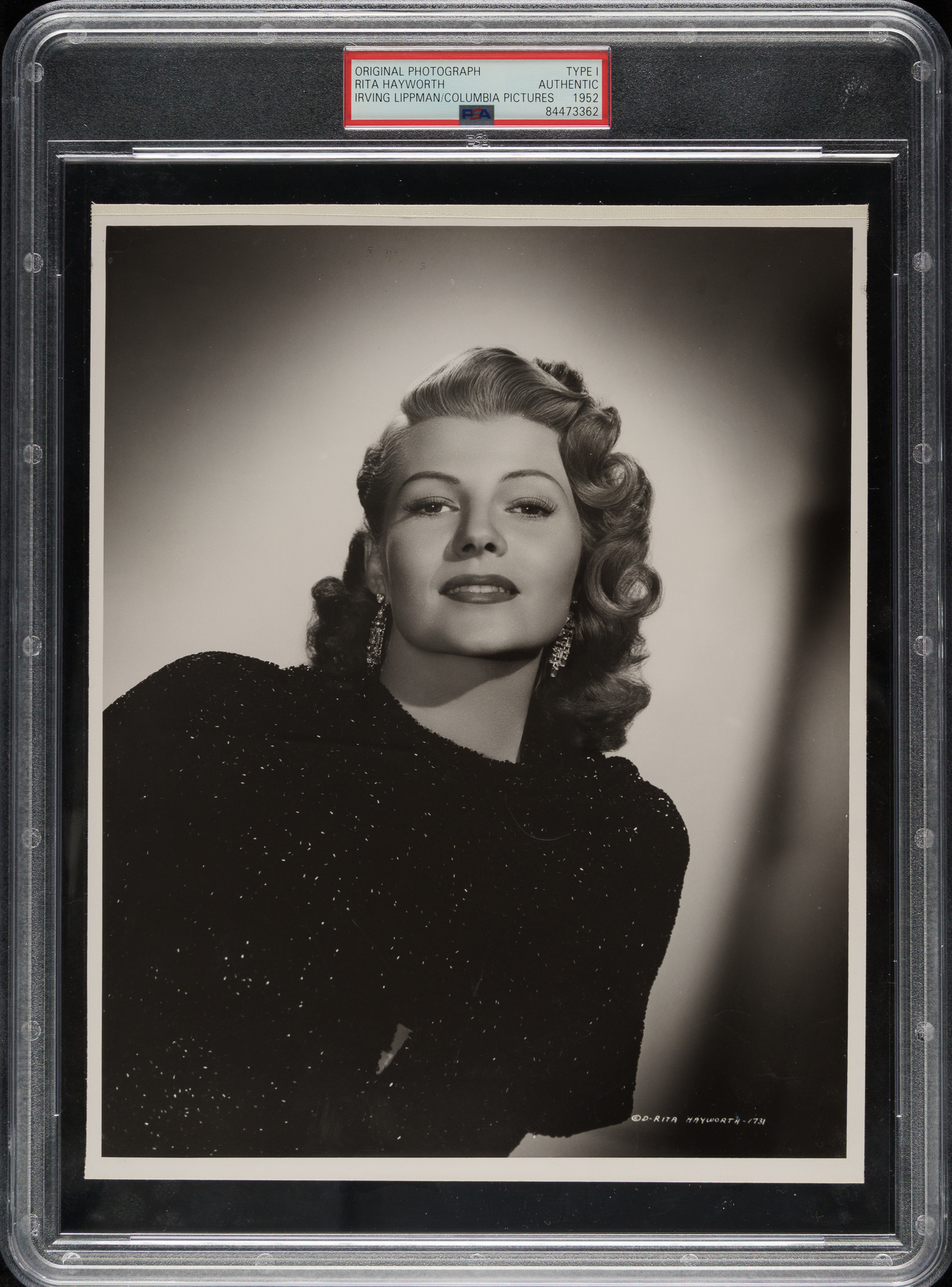 Original photo of actress Rita Hayworth in 1952. Encapsulated and certified as an original Type I photograph by PSA/DNA. The reverse displays a paper caption and a credit stamp of photographer Irving Lippman of Columbia Pictures. The photo (8 x 10 inches) is in Excellent to Near Mint condition overall.
