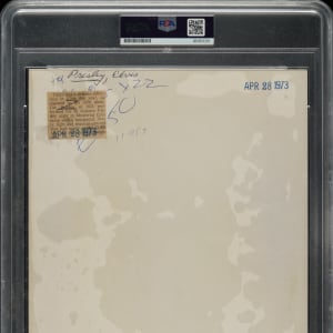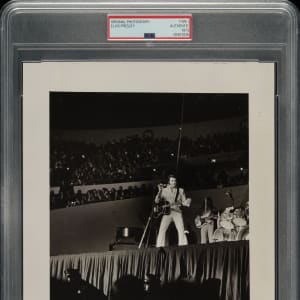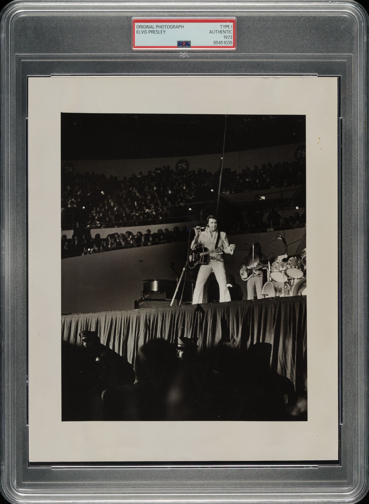 Original news photo of famed musician Elvis Presley performing in 1973. Encapsulated and certified as an original Type I photograph by PSA/DNA. The reverse displays Presley's name, a news clipping, and a pair of "Apr 28 1973" date stamps. The photo (8 x 10 inches) exhibits light creasing and is in Very Good to Excellent condition overall.