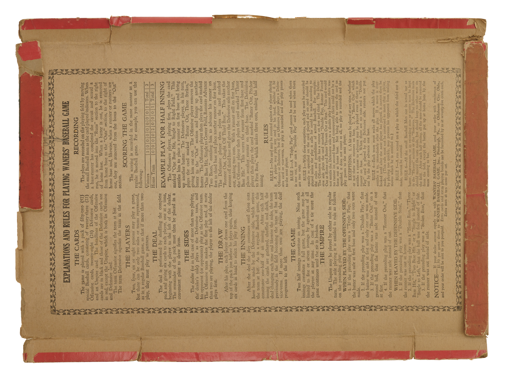Since the 1880s, baseball players have lent their images and endorsements to a wide variety of indoor baseball games. Offered is an example of the Waner's Baseball Game issued in the 1930s. The box lid features portrait images of the legendary Hall of Fame brothers Lloyd and Paul Waner. Included are twenty-four game pegs, fifty playing cards, and the game board. The original box is in Poor condition.