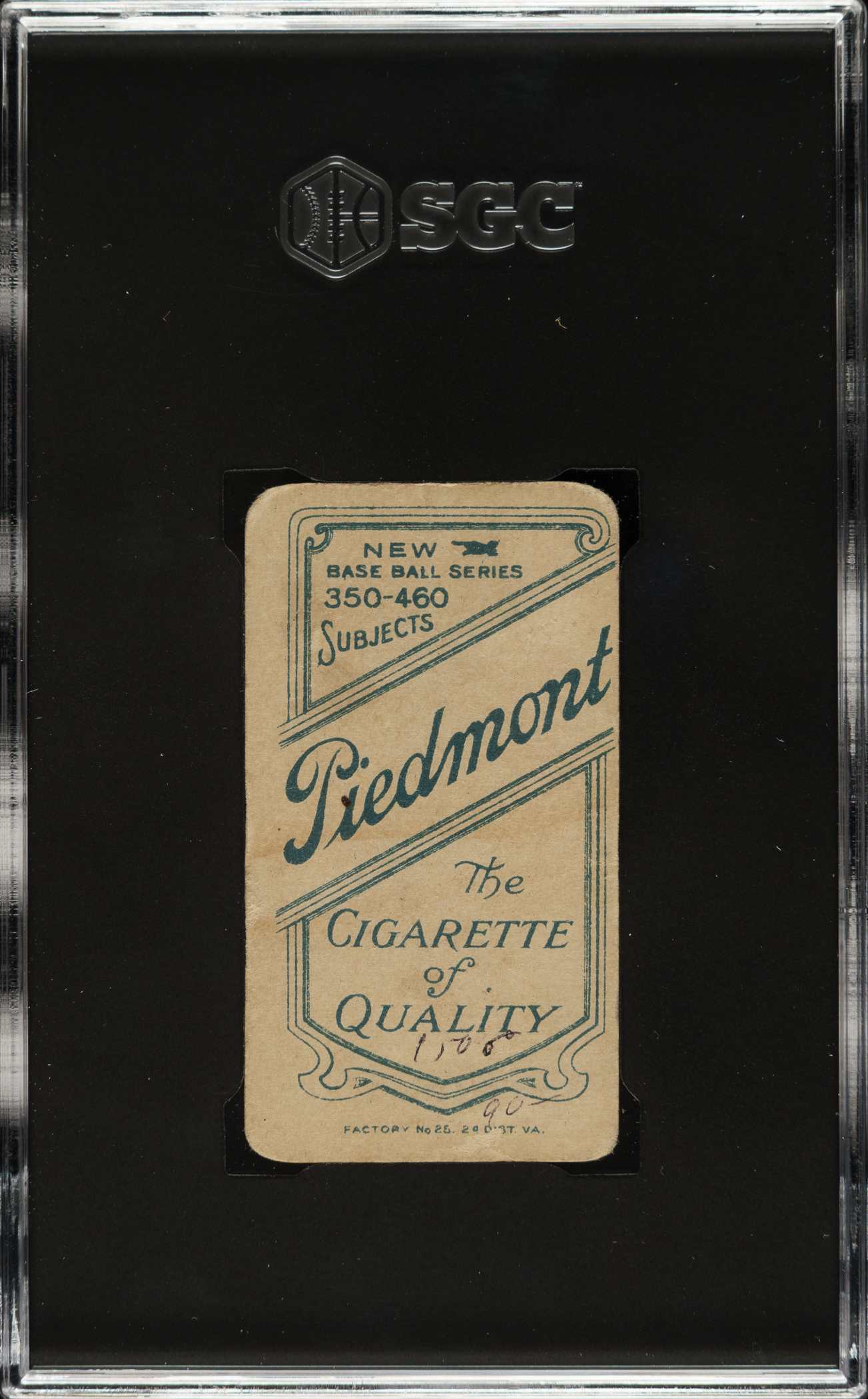 Graded FAIR 1.5 by SGC. Modestly graded example of this classic tobacco card of Detroit Tigers Hall of Famer Ty Cobb from the T206 White Border series. Cobb's red-background portrait pose is one of the key cards in the set and one of the most recognizable of all prewar-era tobacco cards. This well-centered example displays a beautiful red background and a crisp image of Cobb. Flaws include rounded corners, a crease above Cobb's head, and ink notations along the Piedmont 350-460/25 advertising reverse.