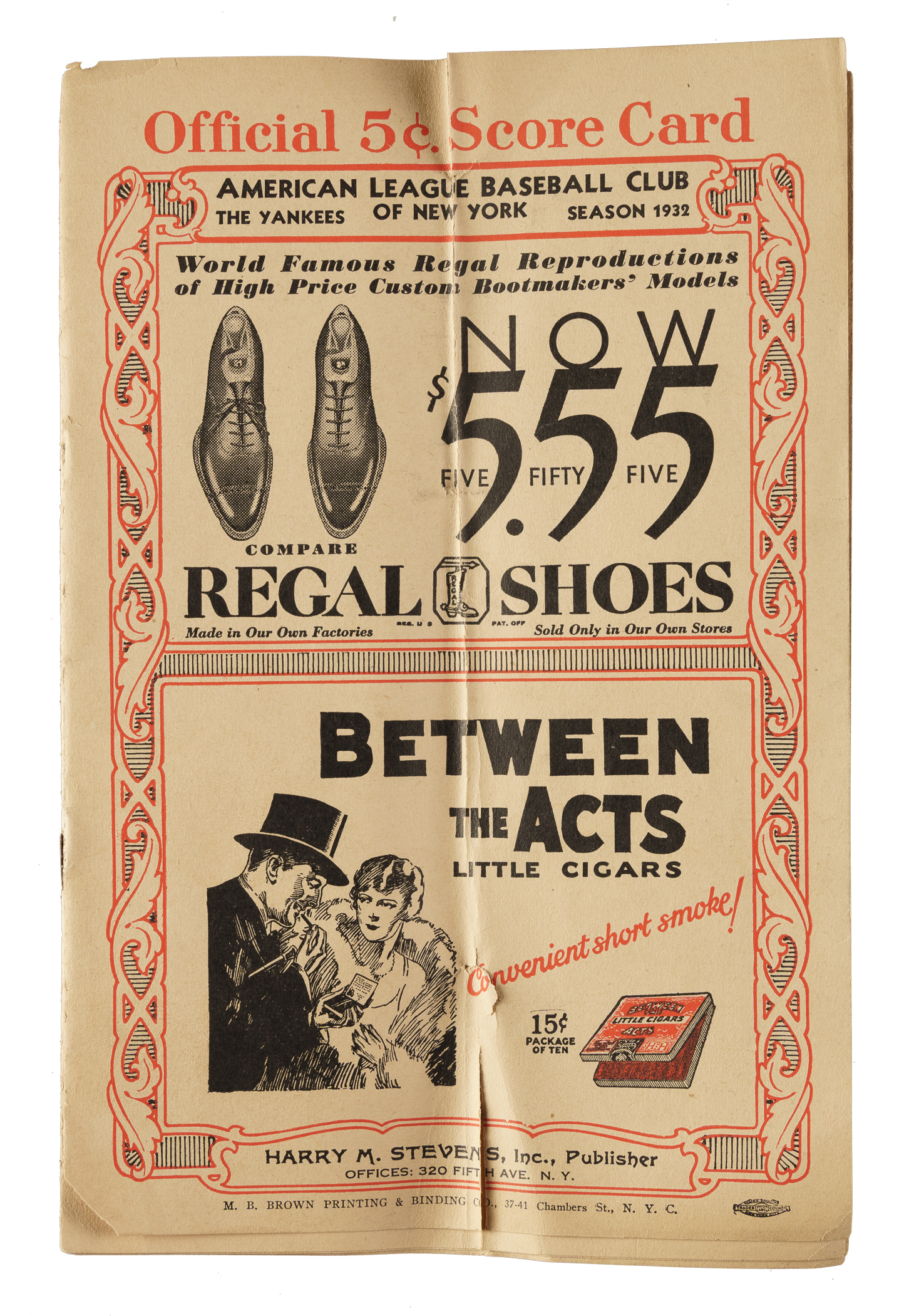 New York Yankees program from their game against the Philadelphia Athletics on May 22, 1932, at Yankee Stadium. Scored in pencil to record the Athletics' 4-2 win. The program's (6.5 x 10 inches) front and back covers are completely detached from the spine, and there is a heavy vertical fold that extends through the entire program. Poor condition overall.